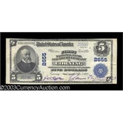 <TABLE cellSpacing=0 cellPadding=0 width="100%" bgColor=#000000 border=0><TBODY> <TR><TD width="100%"><TABLE cellSpacing=1 cellPadding=3 width="100%" border=0><TBODY><TR><TD width="100%" bgColor=#79735c><FONT face=arial color=#ffffff size=3><B>Description</B> </FONT></TD></TR><TR><TD width="100%" bgColor=#ffffff><FONT face=arial size=2><B>A Pair from Corning's First National Bank and Trust Company</B></I><BR>Corning, NY - $5 1902 Plain Back Fr. 609 First NB & TC Ch. # 2655 VF<BR>Corning, NY - $20 1929 Ty. 1 First NB & TC Ch. # 2655 Fine<BR>(200-300 ) (2 notes) </FONT></TD></TR></TBODY></TABLE></TD></TR></TBODY></TABLE><BR><TABLE cellSpacing=0 cellPadding=0 width="100%" bgColor=#000000 border=0><TBODY><TR> 2 notes Important notice: Heritage usually auctions material at the rate of 200-250 lots per hour. On some occasions eBay Live bid software or the Internet may not be able to keep up with the pace of the auction. We recommend placing a realistic absentee bid now as insurance to avoid disappointment. Occasionally the auctioneer may eliminate or reject an eBay Live bid, and the auctioneer may also reopen a lot after the close of the eBay live bidding (usually because we missed an audience bid), and may reject your bid even if it shows you as the winning bidder. By bidding via eBay Live, you agree that Heritage may award the lot to another bidder at its sole discretion under the circumstances described above or any other reasonable circumstances. Also please note that all Heritage lots purchased through eBay Live carry a 20% Buyer's Premium. Please make sure you read the Terms and Conditions before you bid.</TR></TBODY></TABLE>