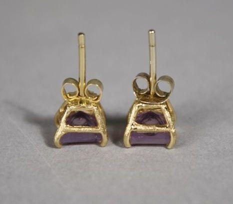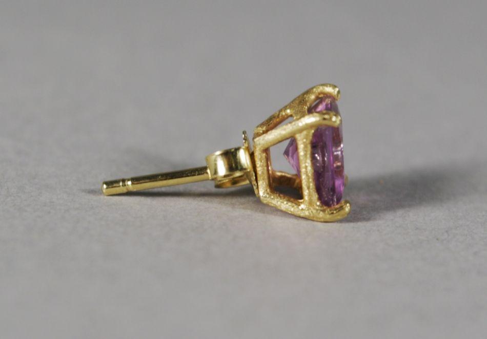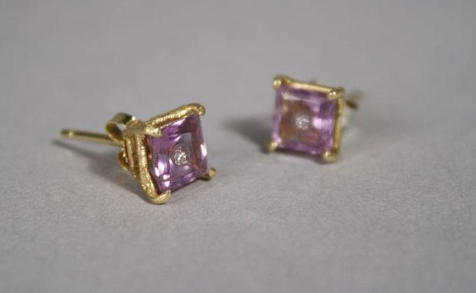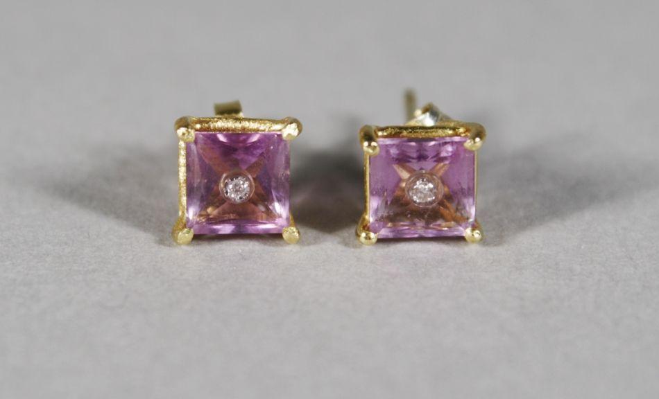 A Pair of 18 kt Yellow Gold and Natural Untreated Square Cut Amethyst Earrings, Square cut amethyst measuring 6 x 6 mm with single diamond melee inset with clear filler.