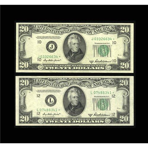 <B>A Pair of 1950B $20 Stars, Including:</B></I><BR><B>Fr. 2061-J* $20 1950B Federal Reserve Note. Gem Crisp Uncirculated.</B></I><BR><B>Fr. 2061-L* $20 1050B Federal Reserve Note. Gem Crisp Uncirculated.</B></I><BR>Two pieces, each a nicely centered and very fresh star example.