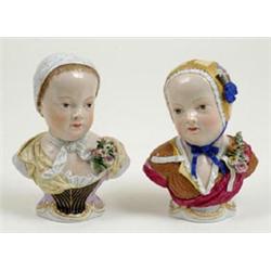 A Pair of 19th Century Meissen Porcelain Busts of Ladies, wearing bonnet and scarf and their dresses with encrusted flowers (some damage) (cross sword marks), 15 cm (2) £150-200