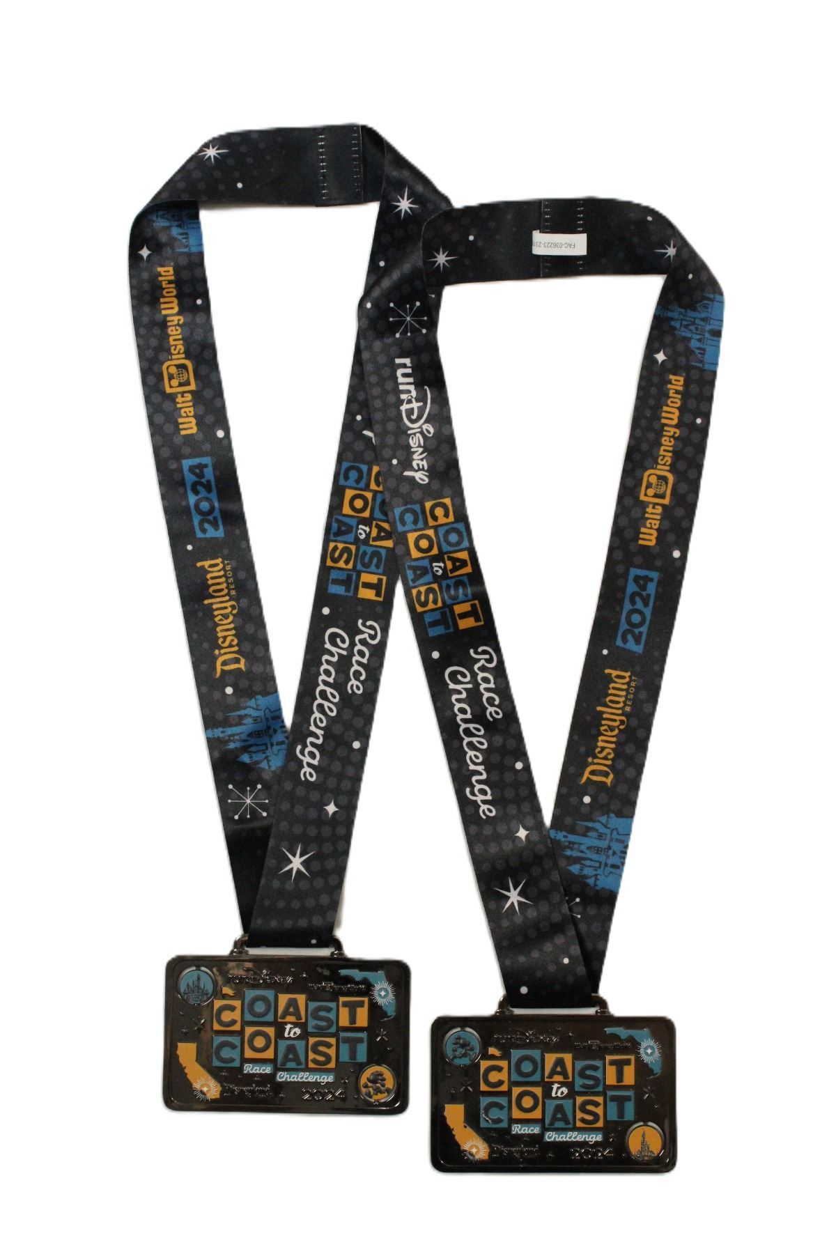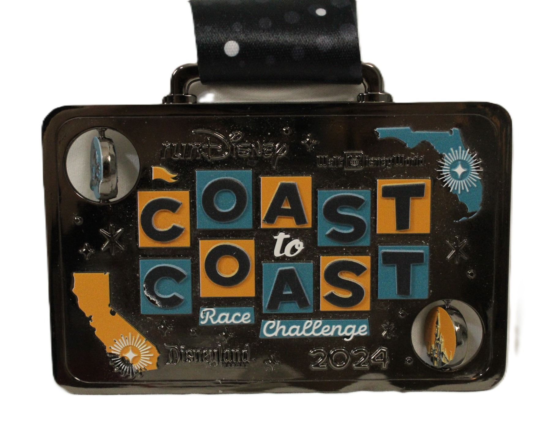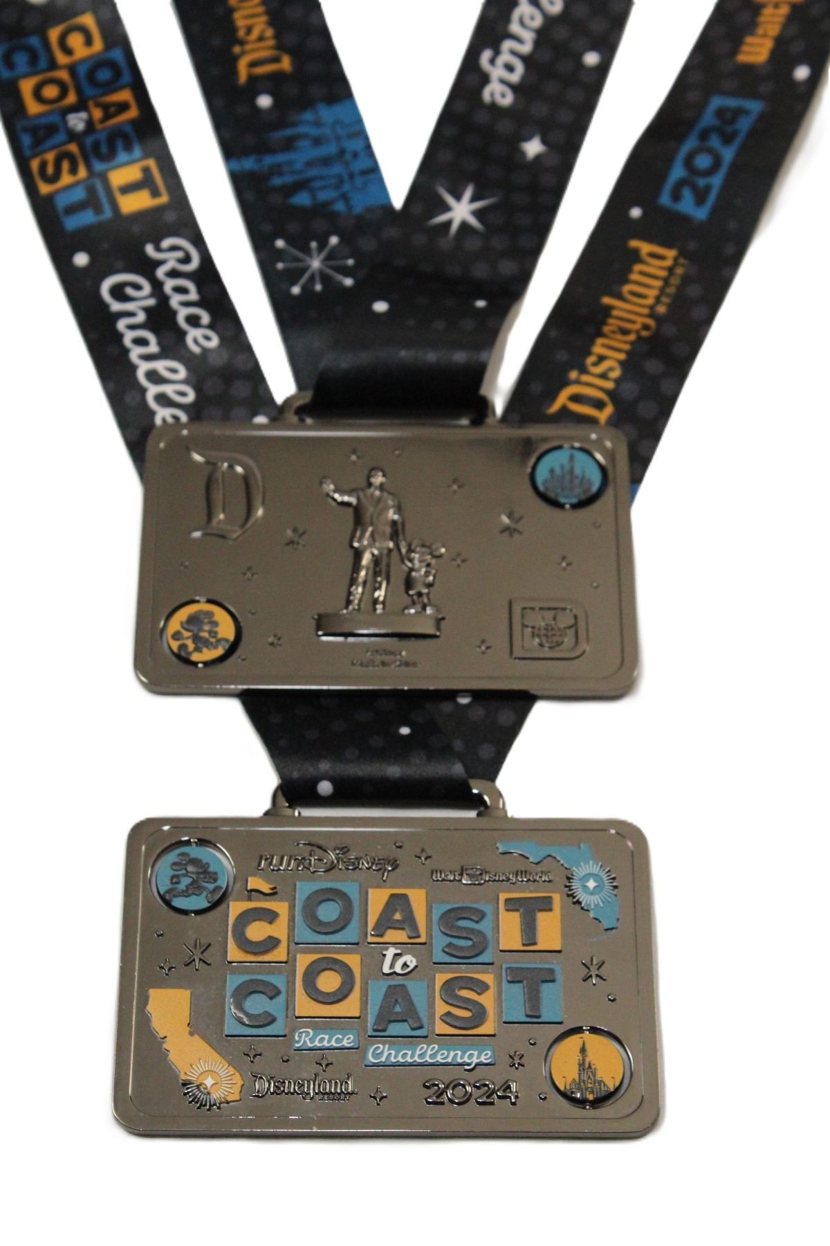 This rectangular version of the 2024 runDisney Coast to Coast medal is given to those participants that complete at least a half marathon or greater at both Walt Disney World and Disneyland in the same calendar year. It features spinning circles with Mickey and Minnie on one side and the castles of each of the two parks on the other. The front includes an image of both Florida and California with a star on their respective park locations. The back features and image of the Partners Statue and the 'D' logos for each resort.