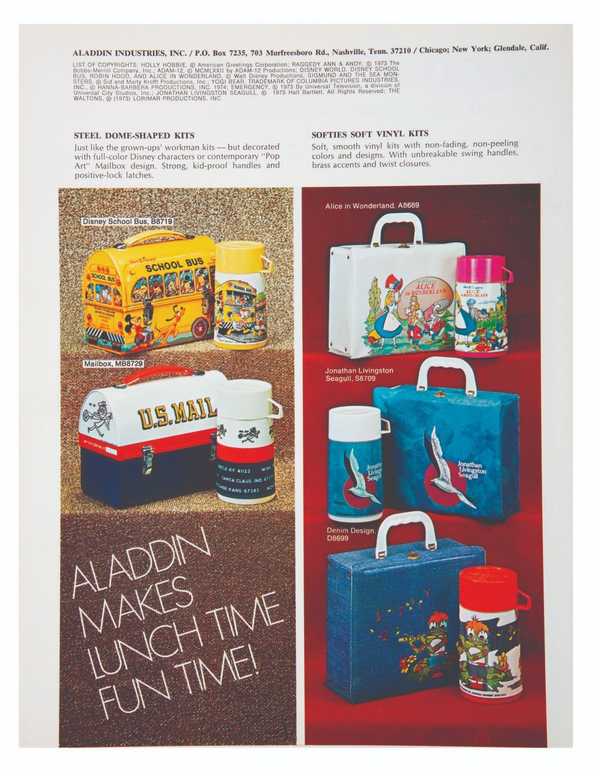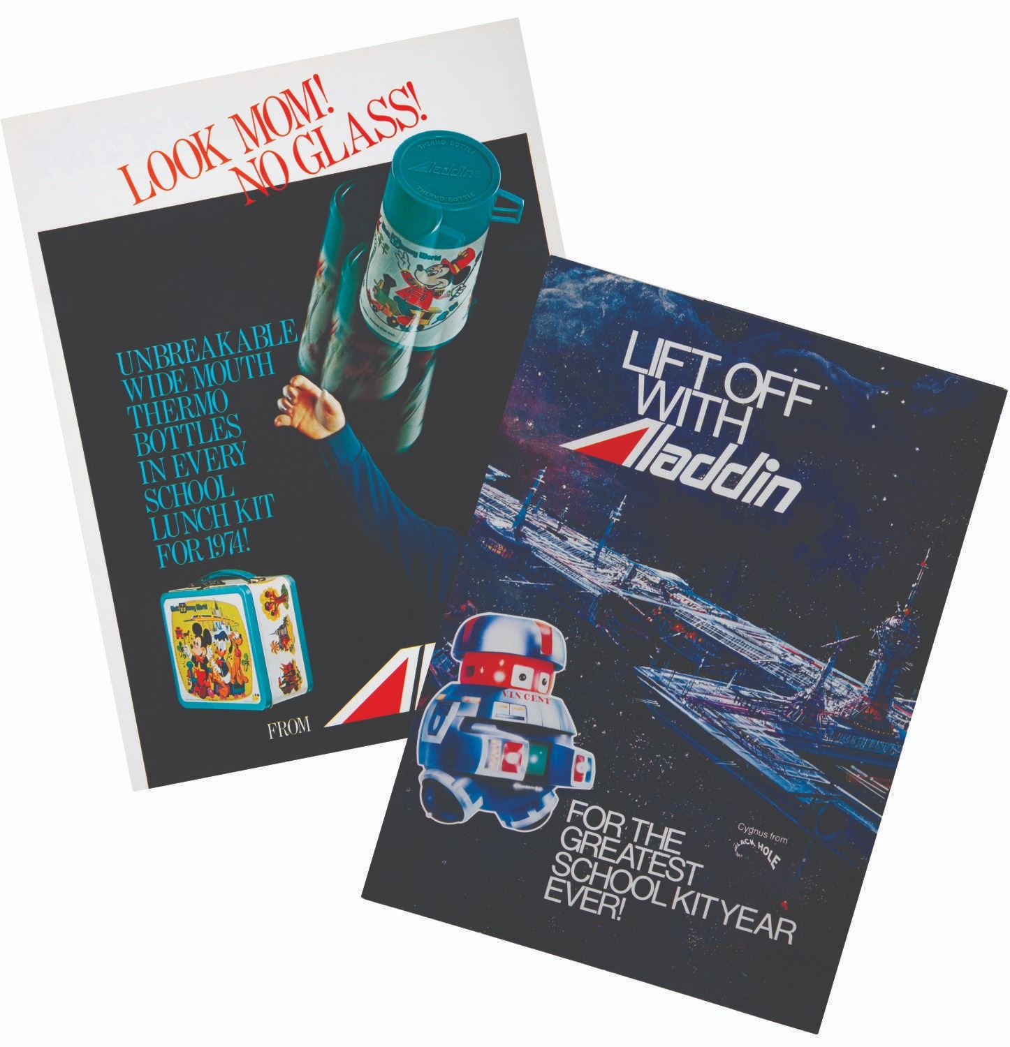 (1974/1980) A pair of promotional flyers for Aladdin lunch boxes in 1974 and 1980. Included in 1974 are lunch boxes from Walt Disney World, “Robin Hood,” and the iconic Mickey School Bus lunch box. The 1980 flyer features “The Black Hole.” Both include other pop culture favorites such as Universal Monsters, Marvel Superheroes, and “Sigmund and the Sea Monsters.” The flyers are in very good condition with light handling wear.