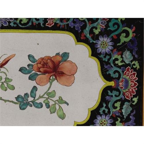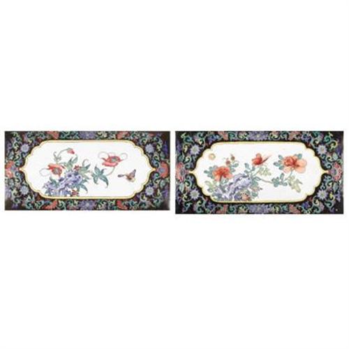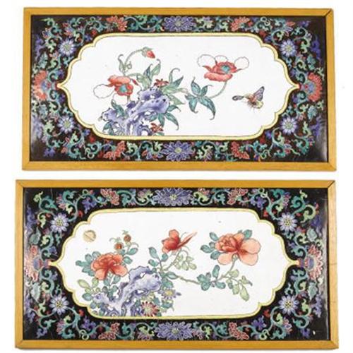 <B>A Pair of Asian Enameled Copper Plaques<BR></B></I>Unknown maker<BR>Nineteenth Century<BR>The plaques, each decorated with a shaped cartouche depicting leafy peonies on a white ground all within a black border of scrolling foliage<BR>Unmarked<BR>10 inches high x 18.5 inches wide<BR><BR>Provenance: <BR>From the property of the Philadelphia Museum of Art<BR><BR><b>Shipping:</b> Requires 3rd Party Shipping (<a target="_blank" href="http://www.heritageauctions.com/common/shipping.php">view shipping information</a>)
