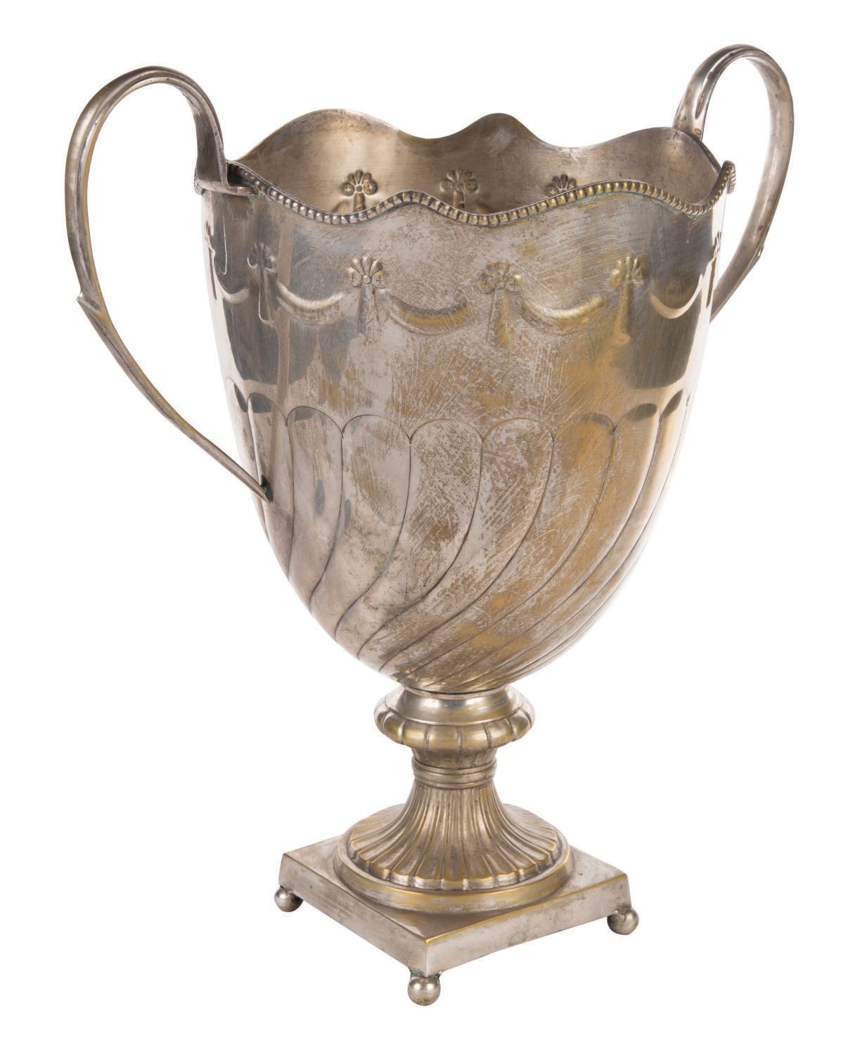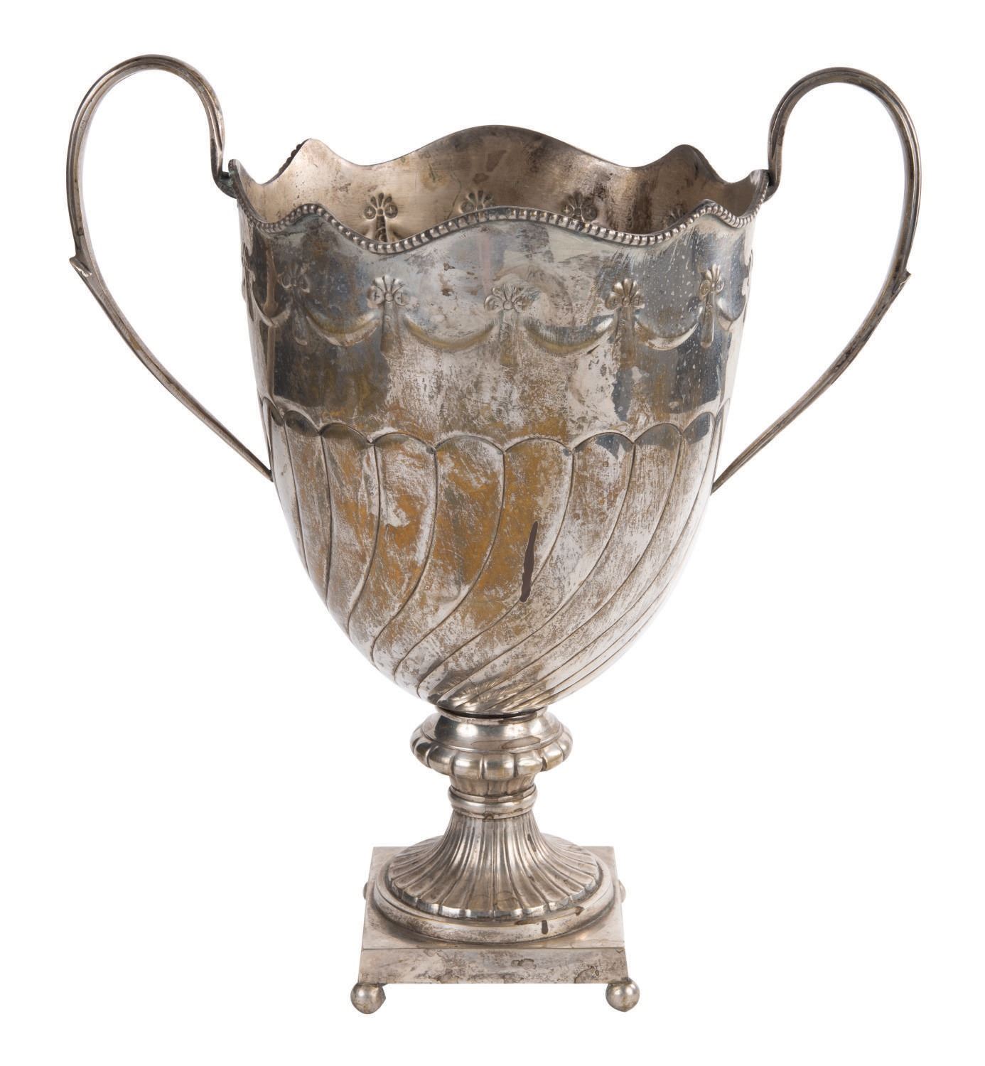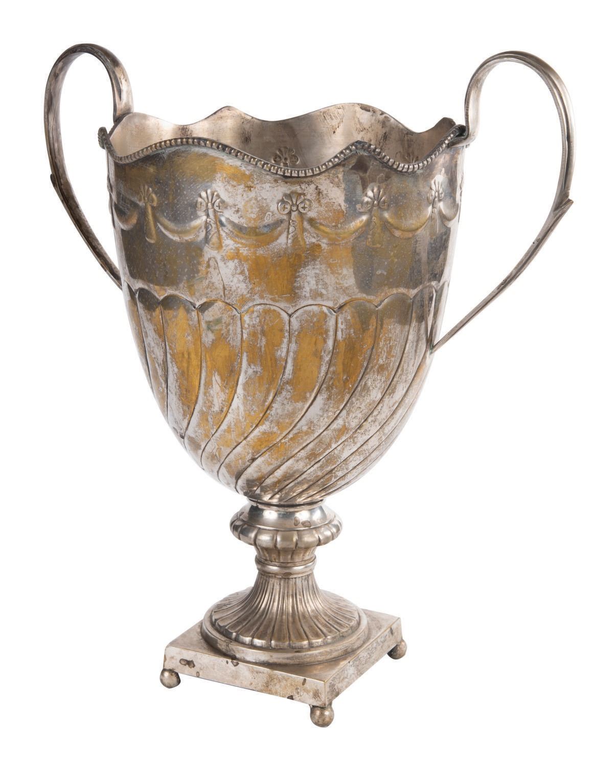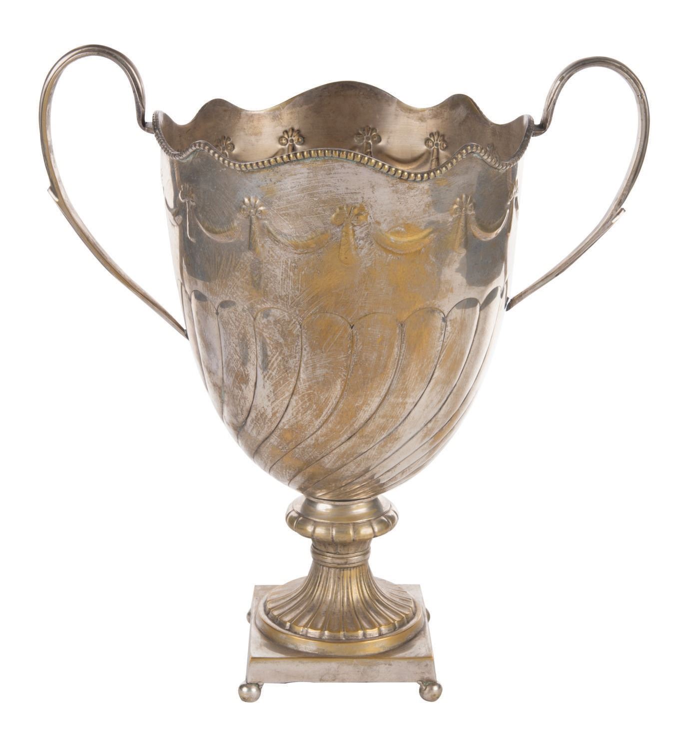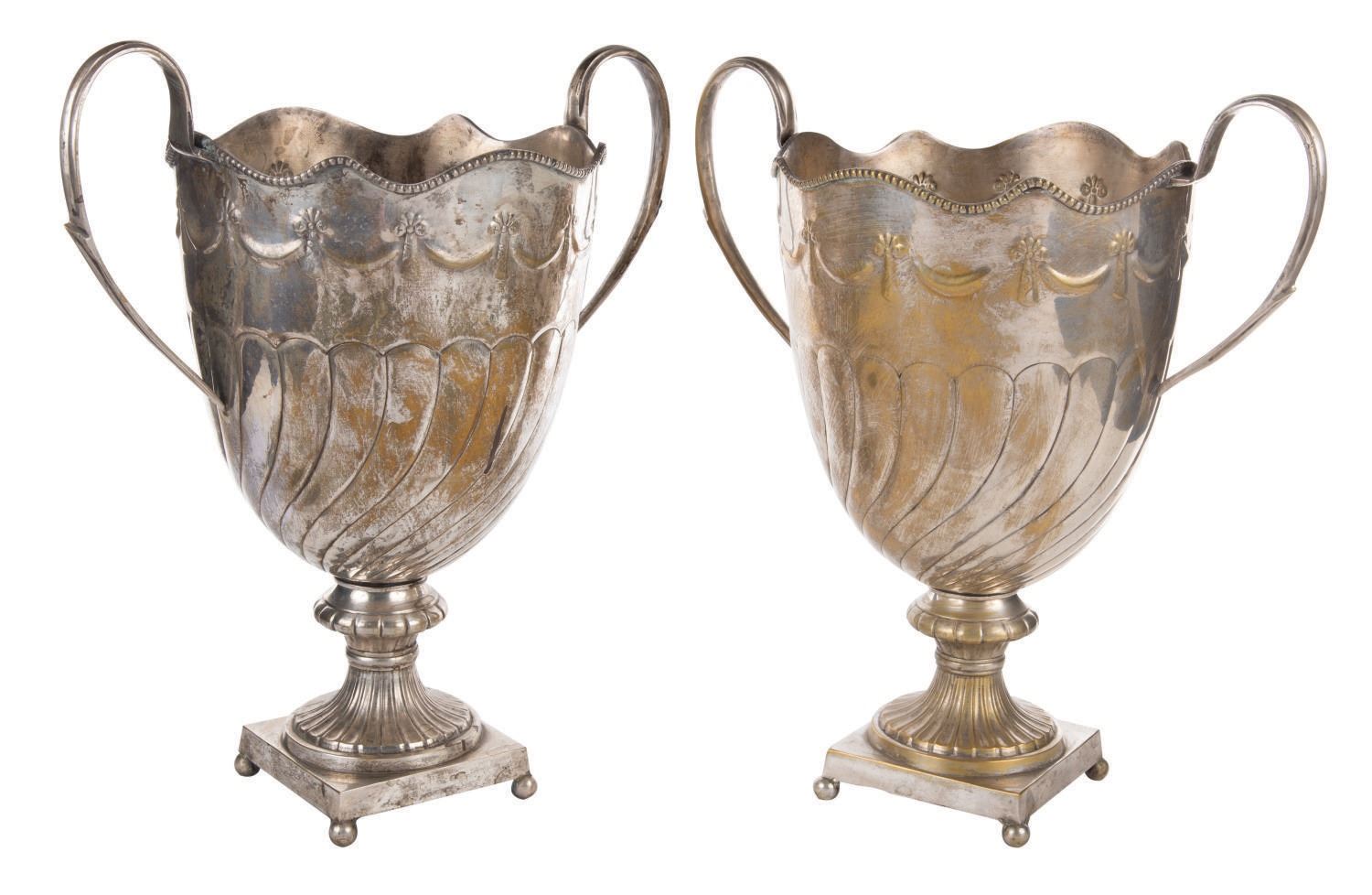 (Walt Disney World, 2010s) A pair of metallic vase props from Be Our Guest Restaurant in The Magic Kingdom. These props once decorated areas over dining guests. Measuring 16.75" tall and 15.5" at its widest diameter, each stamped pot metallic prop exhibits minor tarnishing throughout.