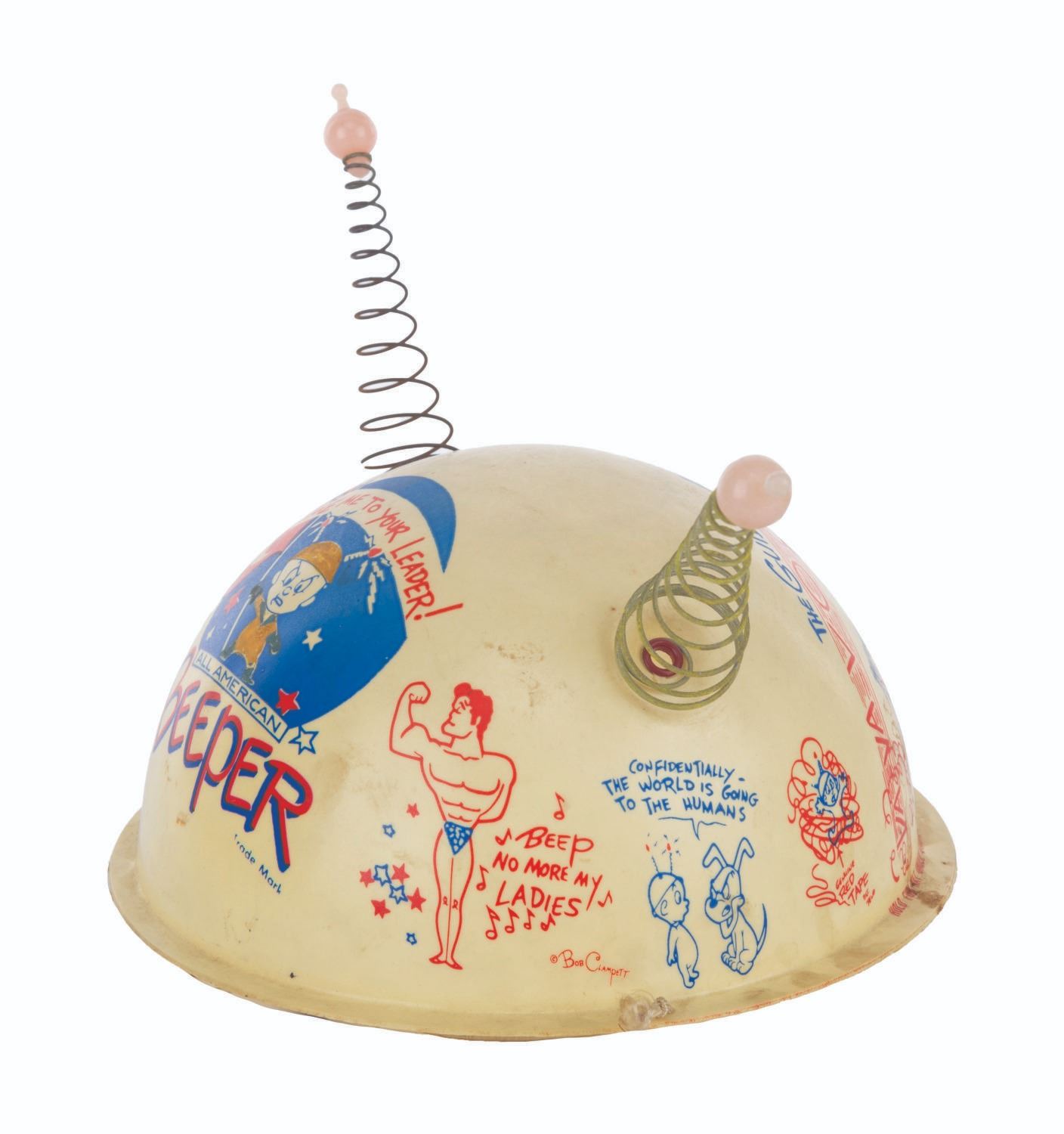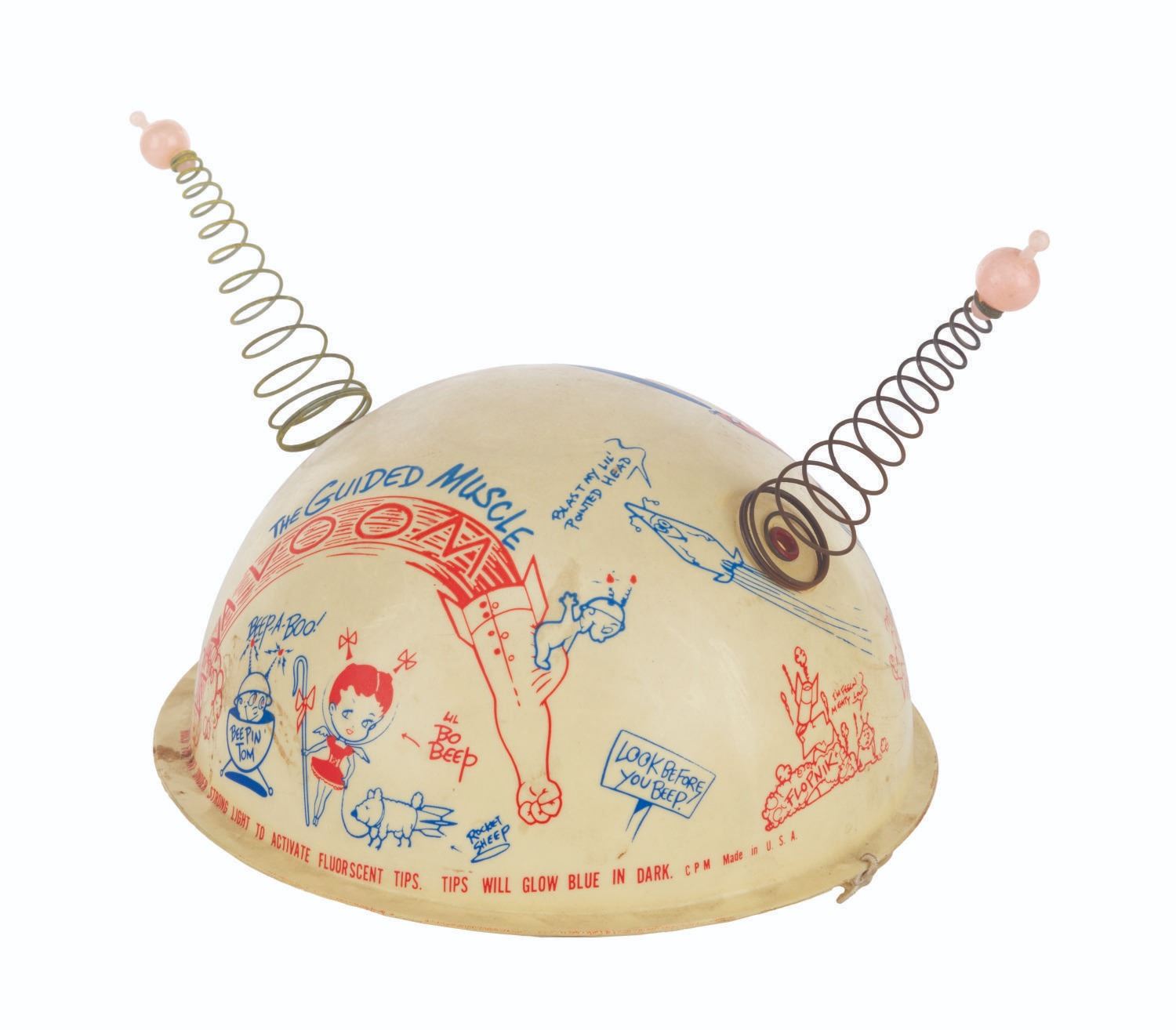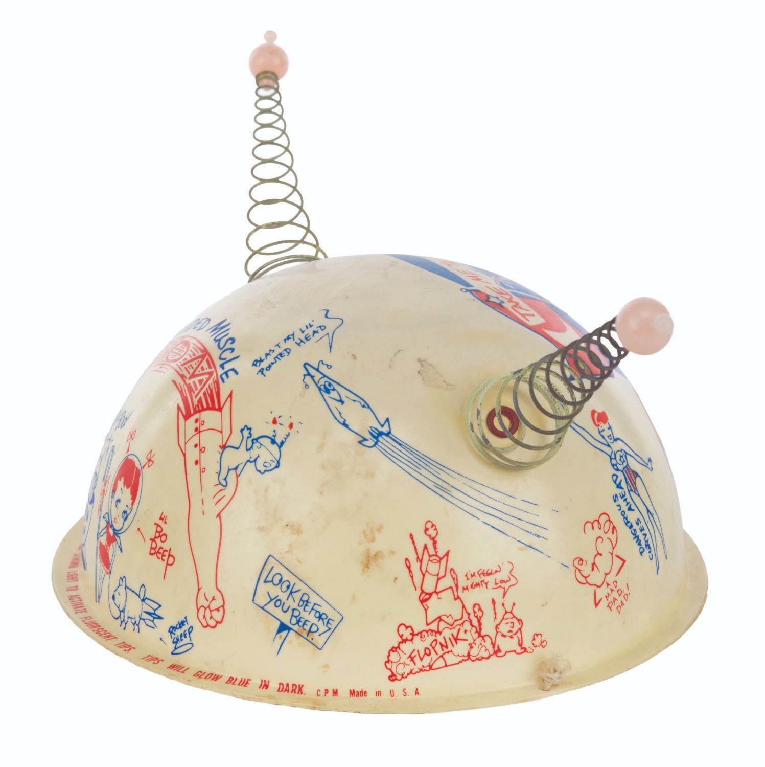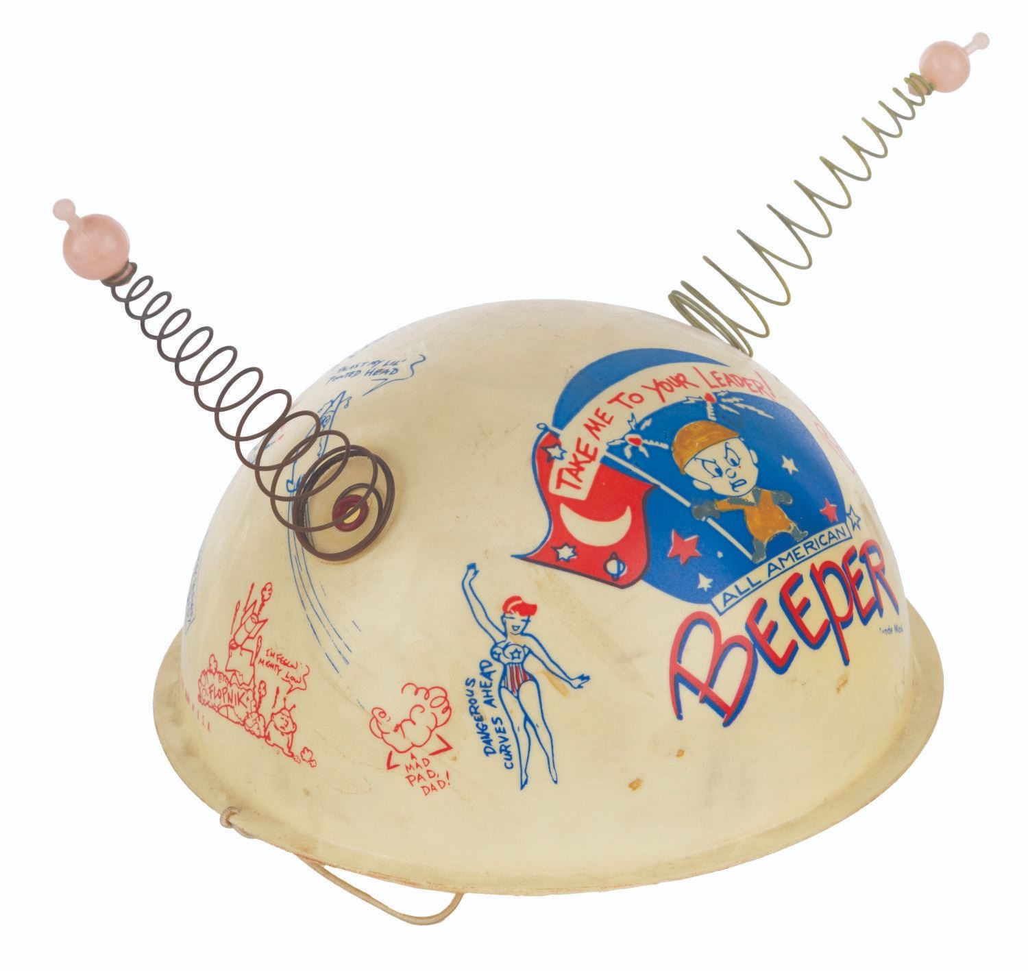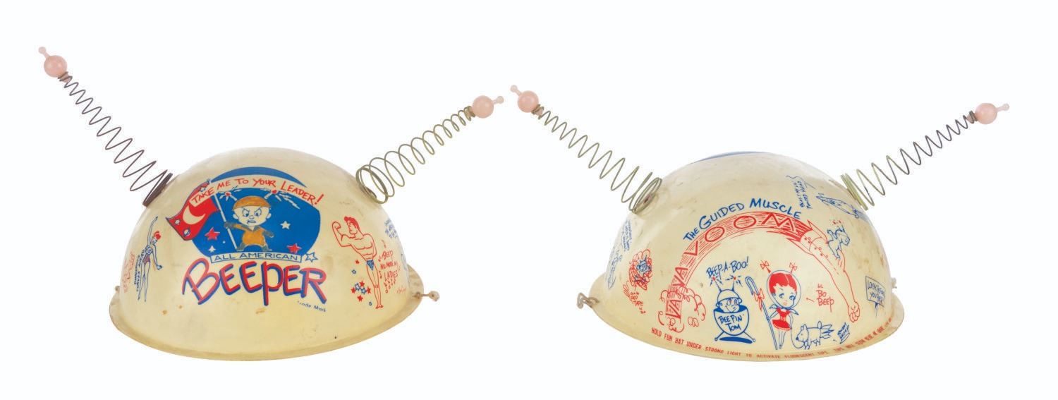 (Clampett, 1959) A pair of children's antennae-topped helmets printed with illustrations relating to Bob Clampett’s unproduced series “Beeper and his Guided Muscle.” When tested for function, the tops of the antennae glowed blue. Measuring 6.5” in diameter and 4.5” tall, the helmets are in good condition with discoloration from age, stains, scuffs, and wear.