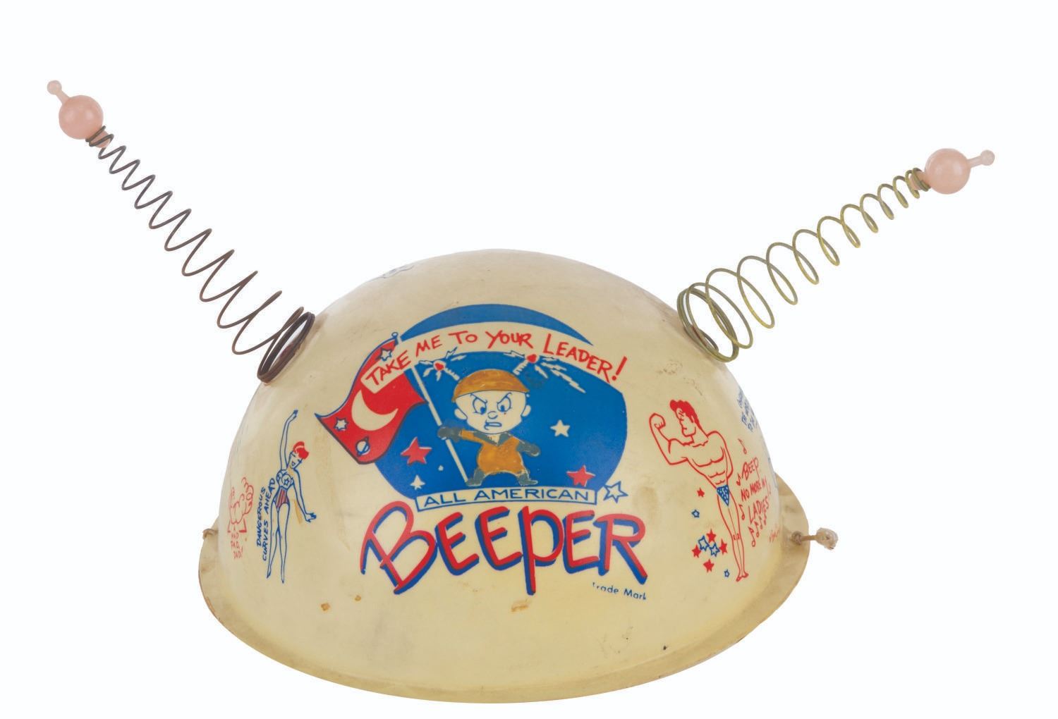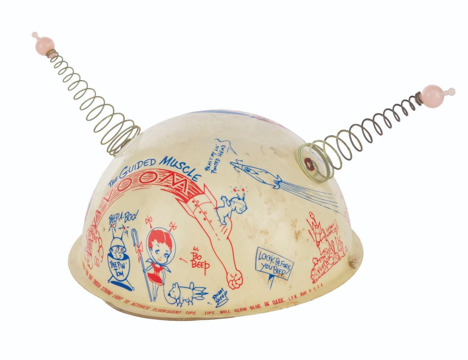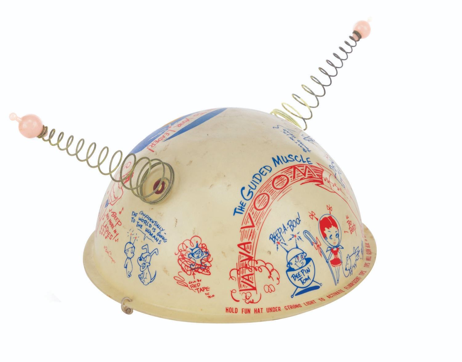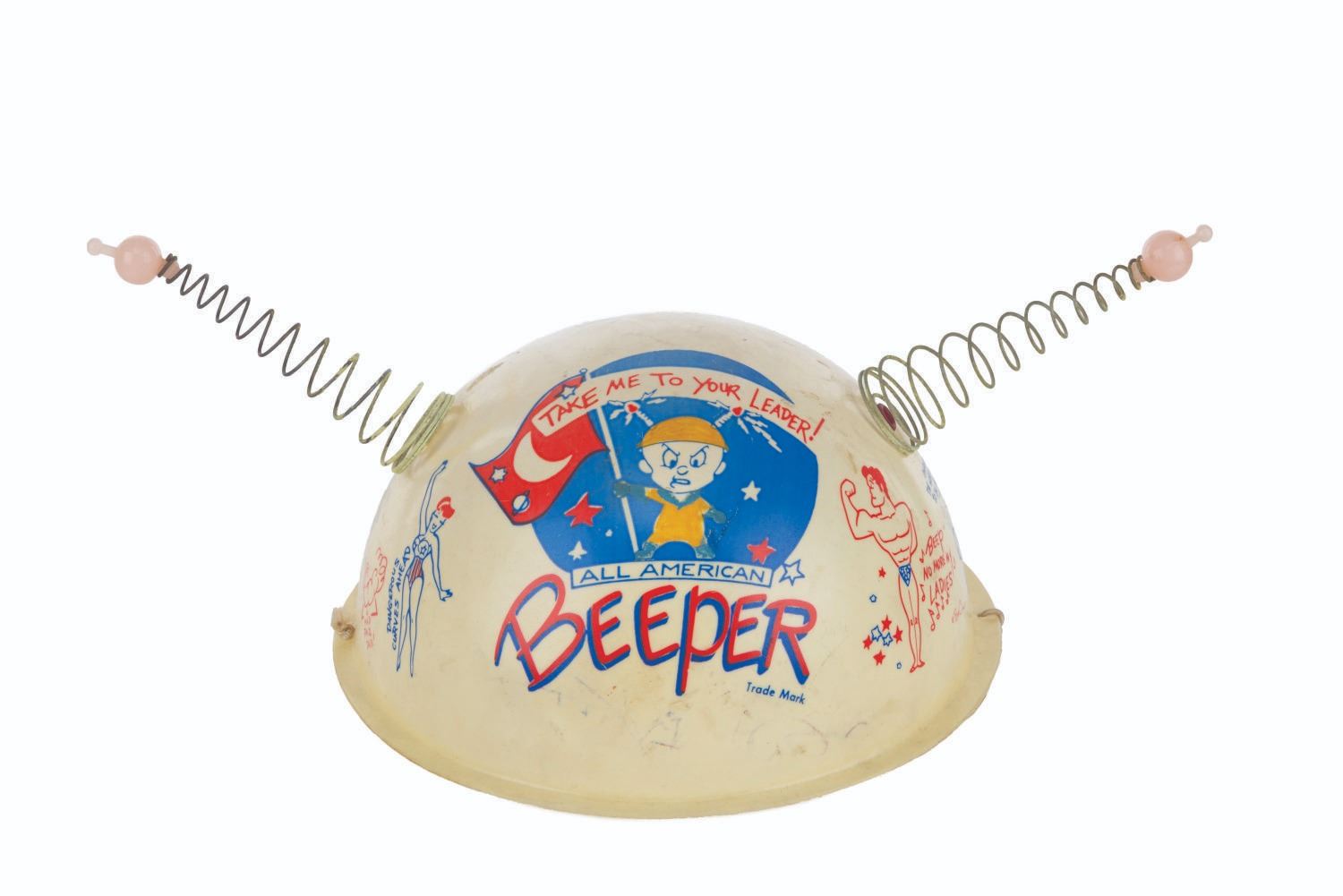 (Clampett, 1959) A pair of children's antennae-topped helmets printed with illustrations relating to Bob Clampett’s unproduced series “Beeper and his Guided Muscle.” When tested for function, the tops of the antennae glowed blue. Measuring 6.5” in diameter and 4.5” tall, the helmets are in good condition with discoloration from age, stains, scuffs, and wear.