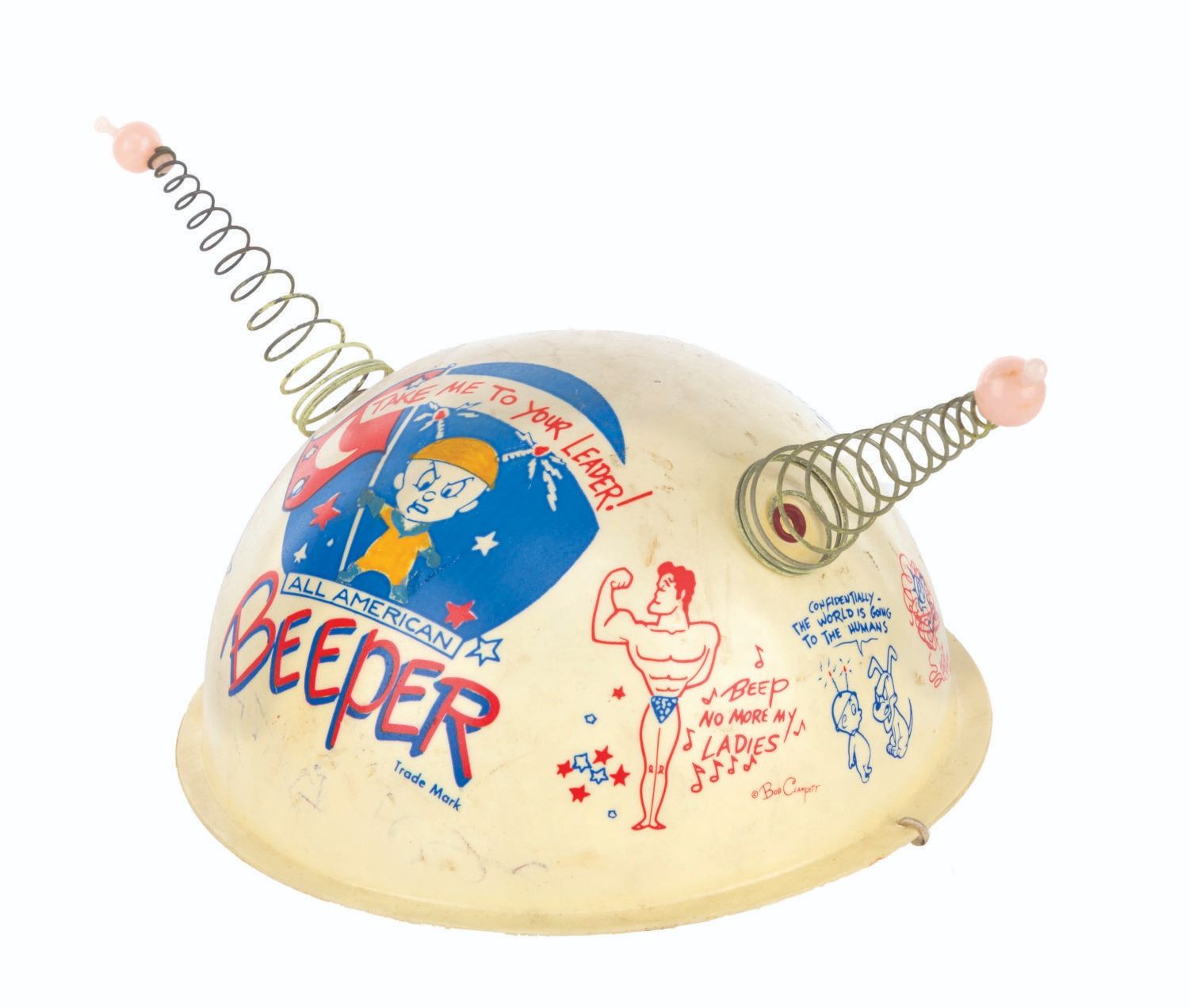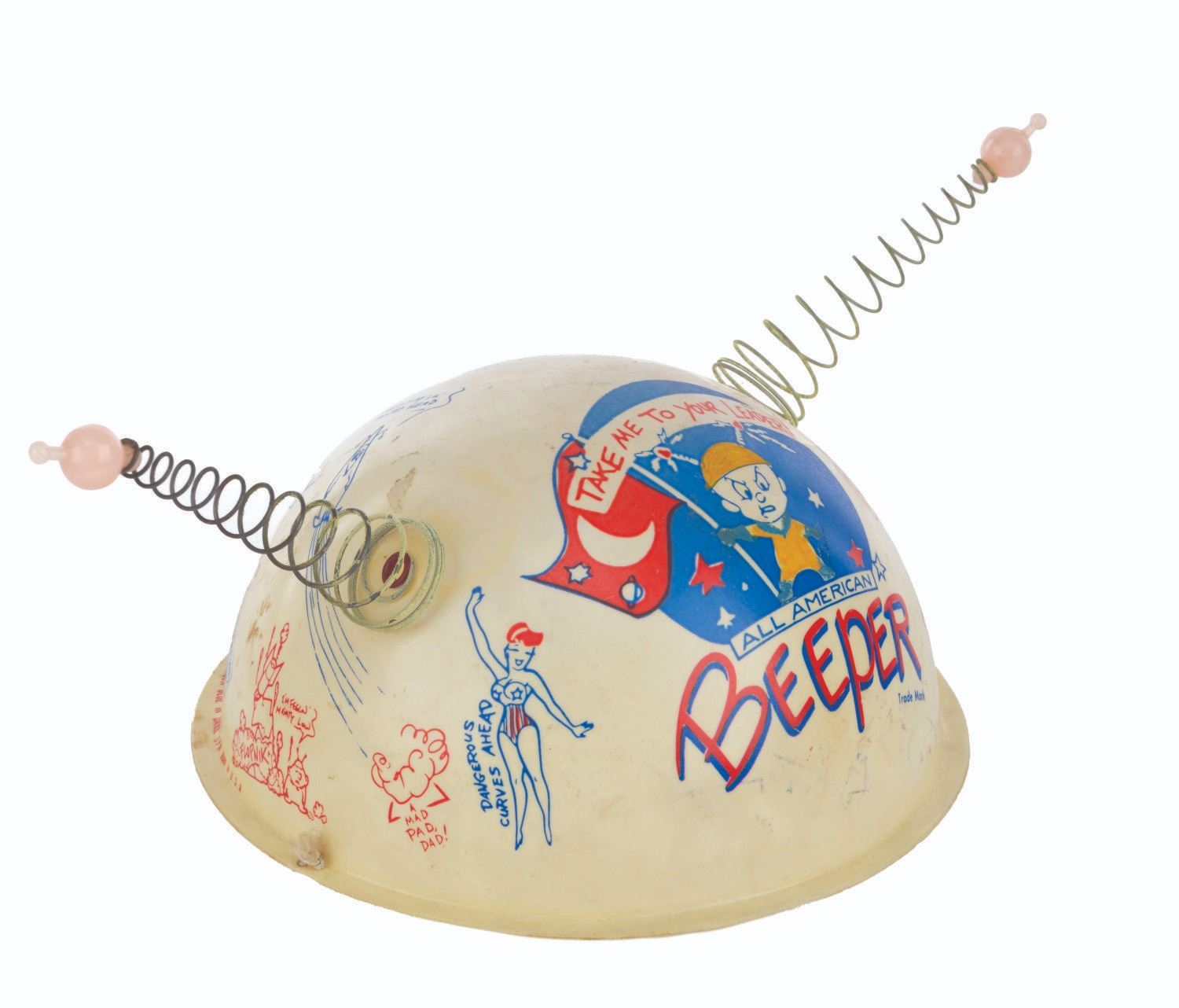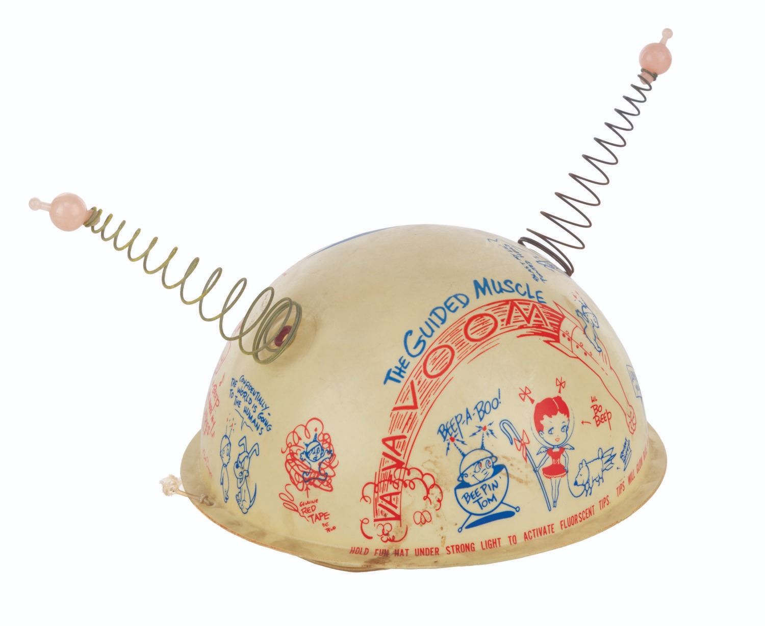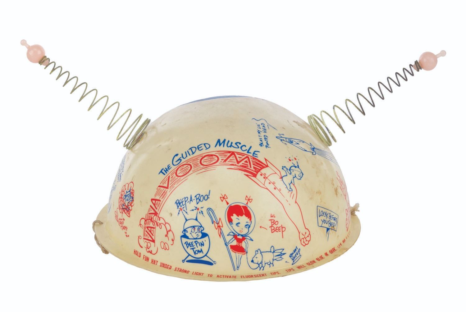 (Clampett, 1959) A pair of children's antennae-topped helmets printed with illustrations relating to Bob Clampett’s unproduced series “Beeper and his Guided Muscle.” When tested for function, the tops of the antennae glowed blue. Measuring 6.5” in diameter and 4.5” tall, the helmets are in good condition with discoloration from age, stains, scuffs, and wear.