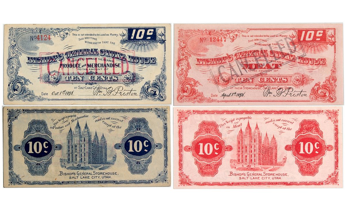 1898 Blue 10c S/n 4142, PMG About Uncirculated 55 & Red 10c S/n 12447 PMG About Uncirculated 55. These cancelled notes were sold and traded by the Church in the 1970's and 80's to collectors and dealers. Shoebox size accumulations were distributed and all were stamped 'Cancelled' by the Church prior to sale. Today virtually all the hoards have been broken nd individual specimans come to the market on a regular basis. Nice Duo to add to your collection. Exceptionally paper quality. Rust 260 & 261. - HKA#66173