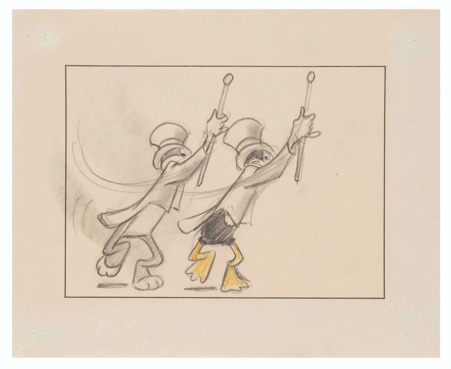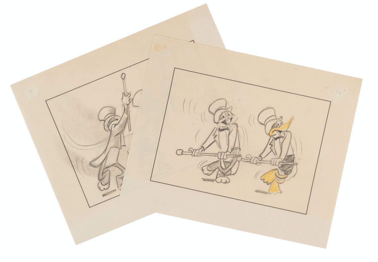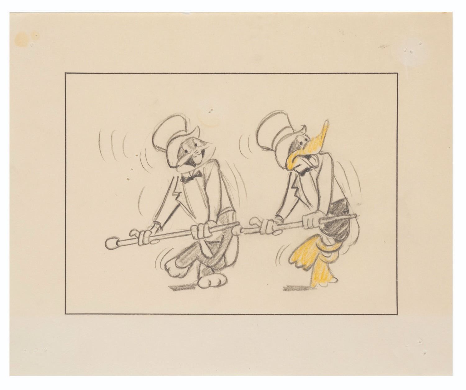 (Warner Bros. 1957) A pair of original storyboard panels featuring Bugs and Daffy from the Looney Tunes short “Show Biz Bugs.” Accomplished in graphite and colored pencil and measuring 5.75” x 7”, the panels are in very good condition with pinholes from production use and light discoloration from age.