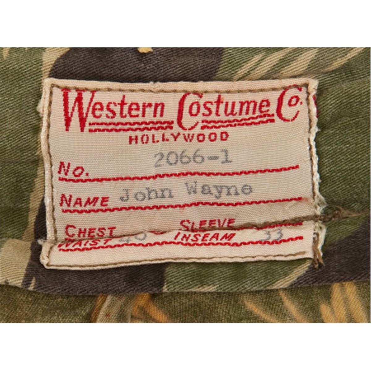 A Pair of Camouflage Fatigues from "The Green Berets." Warner Bros./Seven Arts, 1968. Of standard military design, made of cotton with an olive green and black pattern; shirt has long sleeves, two button-down breast pockets, Western Costume Co. label reads "No. 2066-1 / John Wayne / Chest 48 / Sleeve 19;" together with a pair of matching pants, numerous front, back and side pockets, WCC label reads "No. 2066 - 1 / John Wayne / Waist 40 / Inseam 33;" worn as Wayne portrayed "Colonel Mike Kirby" in the film that co-starred David Janssen.