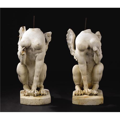 <B>A Pair of Carved Marble Sphinx</B></I><BR><BR>Italian<BR>Late eighteenth/early nineteenth century<BR>Marble<BR>32 inches high each<BR><BR>Each well carved figure with large articulated paws and claws, each with one front paw raised, with carved wings, tail, and hair on squared marble bases. <B>Condition Report:</B> Normal signs of wear as appropriate with age. Lacking heads, wings, and front lifted paws.<BR><BR><b>Shipping:</b> Requires 3rd Party Shipping (<a target="_blank" href="http://www.heritageauctions.com/common/shipping.php">view shipping information</a>) <BR><BR><B>Important notice:</