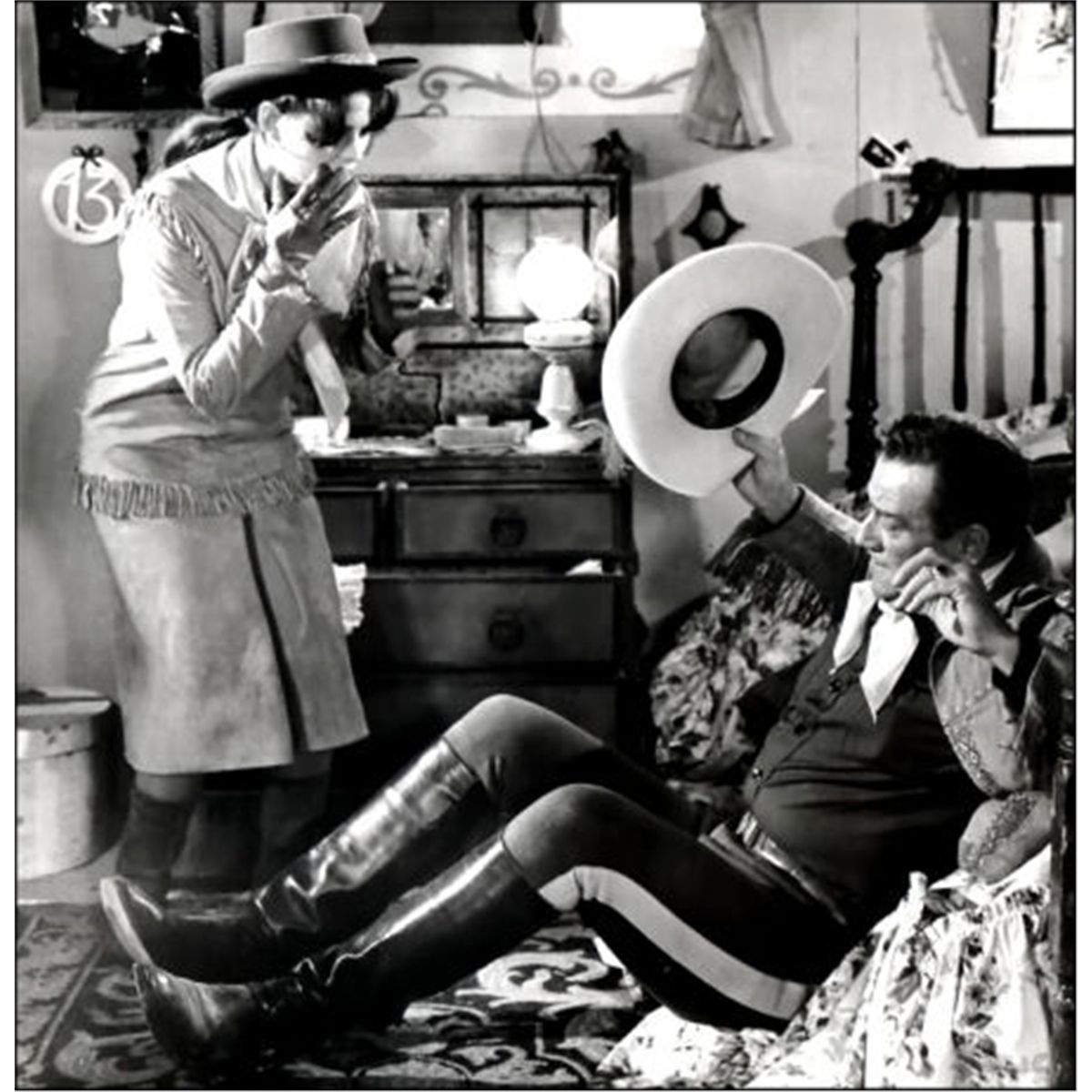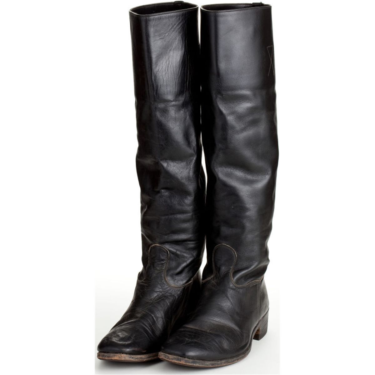 A Pair of Cavalry Riding Boots from "The Undefeated." 20th Century Fox, 1969. Made of black leather, knee-high, simple stitched detail on top of shaft, wooden spur ridge on back of heel, resoled later; worn by Wayne in the film; Wayne likely wore these boots in other cavalry films such as "The Horse Soldiers" from 1959 or "Rio Lobo" from 1970 and he may have even used them as early as 1948-1950 in John Ford's 'Cavalry Trilogy' but because the boots were re-soled, it is impossible to know for certain.