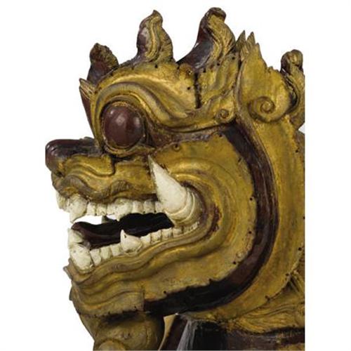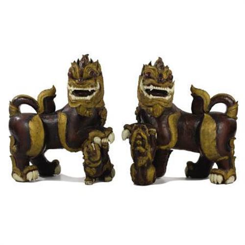 <B>A Pair of Chinese Carved Temple Dogs<BR></B></I>Unknown maker<BR>Nineteenth Century<BR>The two female temple dogs in red lacquer with gold highlights, white teeth and claws, raised paw playing with pup<BR>Unmarked<BR>37 inches high x 35 inches wide<BR><BR><b>Shipping:</b> Requires 3rd Party Shipping (<a target="_blank" href="http://www.heritageauctions.com/common/shipping.php">view shipping information</a>)