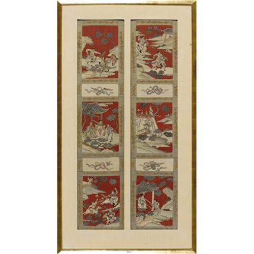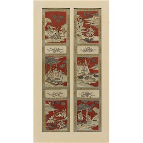 <B>A Pair of Chinese Embroidery Panels<BR></B></I>Unknown maker, China<BR>Late Nineteenth/Early Twentieth Century<BR>Silk<BR>Unmarked <BR>41 inches high x 20 inches wide <BR> <BR>Two Chinese embroidered panels on silk depicting warriors and sages, on faded red silk ground and embroidered in gray, white, gold and purple thread. Each panel of three scenes, mounted side by side.<BR><BR><BR><b>Shipping:</b> Requires 3rd Party Shipping (<a target="_blank" href="http://www.heritageauctions.com/common/shipping.php">view shipping information</a>)