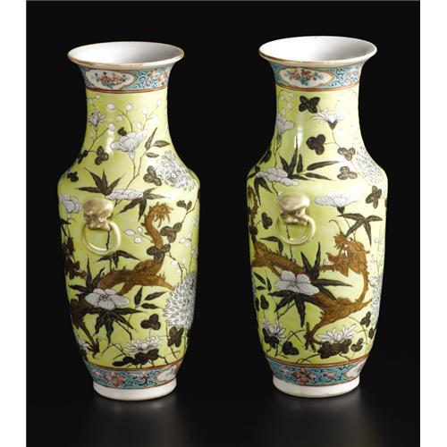 <B>A Pair of Chinese Porcelain Vases</B></I><BR><BR>Unknown maker, Chinese<BR>Late nineteenth century<BR>Porcelain with polychrome enamel and gilt decoration<BR>Unmarked<BR>10.13 inches high<BR><BR>The yellow ground baluster form vases with dragon and chrysanthemum decoration between turquoise borders.<BR><BR><b>Shipping:</b> Requires 3rd Party Shipping (<a target="_blank" href="http://www.heritageauctions.com/common/shipping.php">view shipping information</a>)