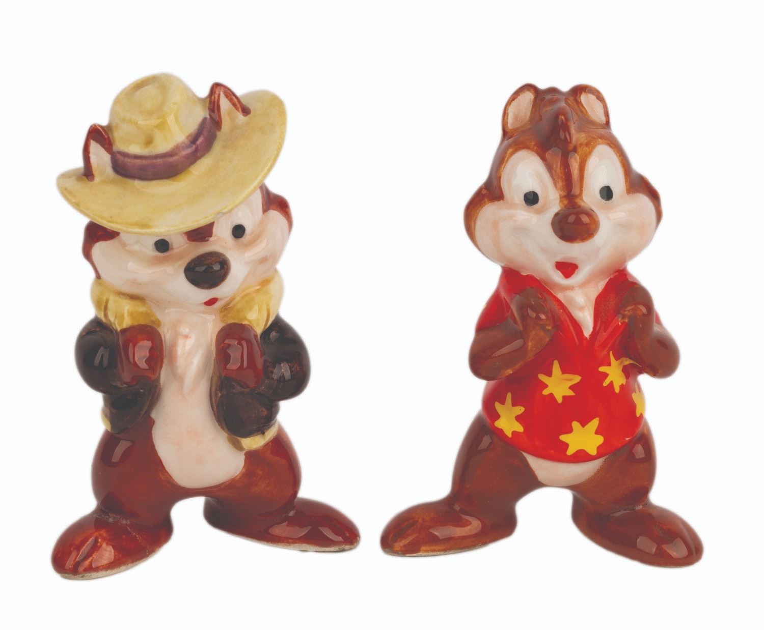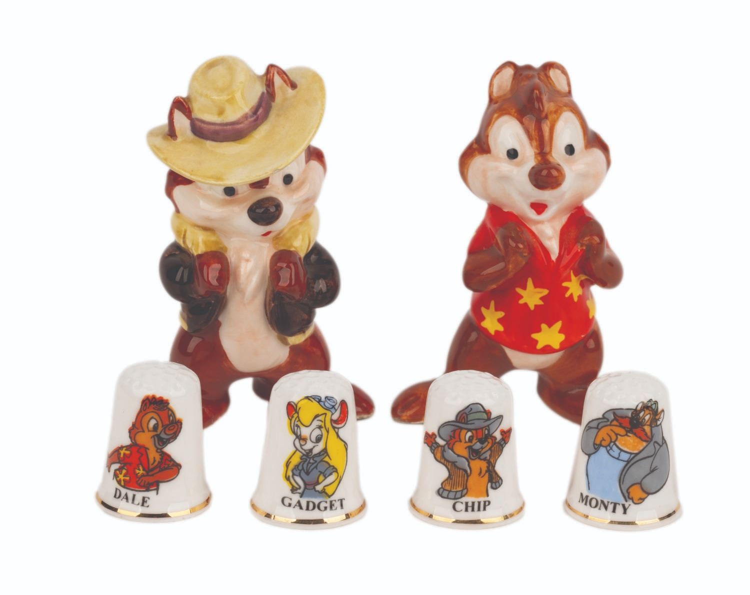 (Disney, 1980s-1990s) A pair of "Chip 'n Dale Rescue Rangers" ceramic figurines and a rare set of four thimbles featuring the popular Disney Afternoon characters, manufactured by Birchcroft China Gt. Britain. Measuring from 0.75" x 1.25" to 2" x 3", the thimbles and figurines are in very good condition, with a small chip on the front of Chip's hat.