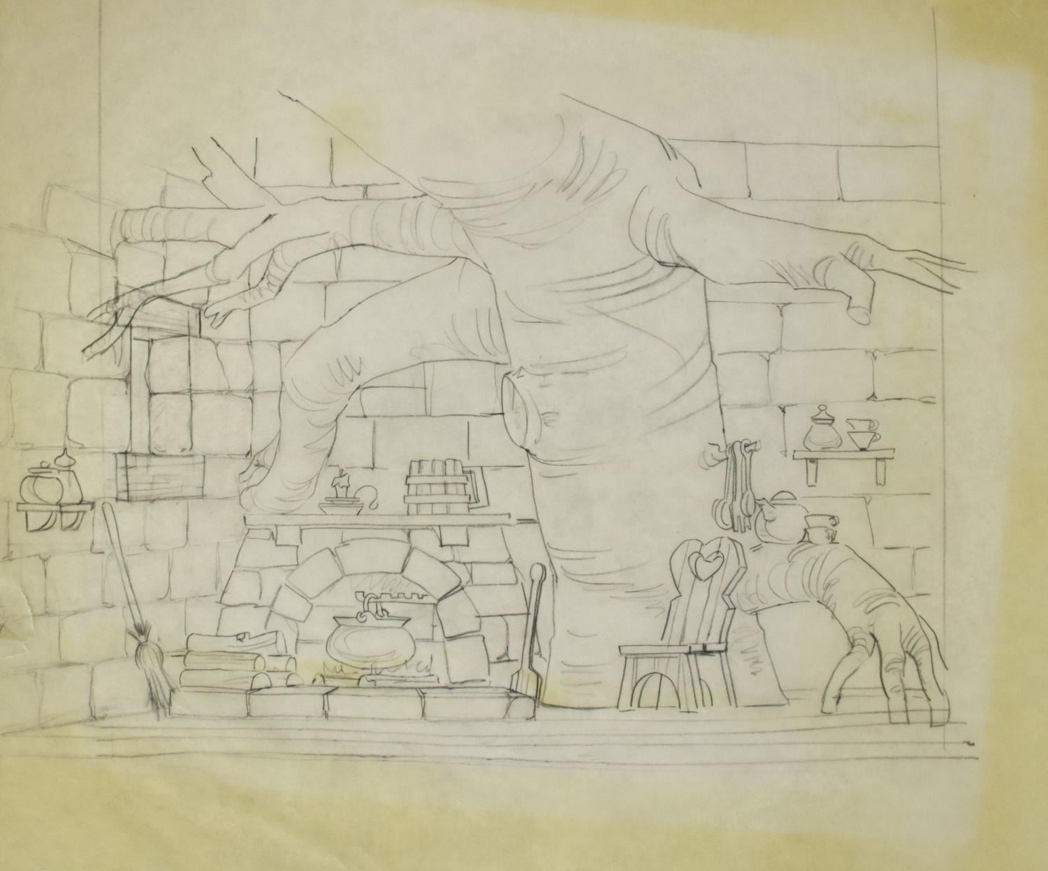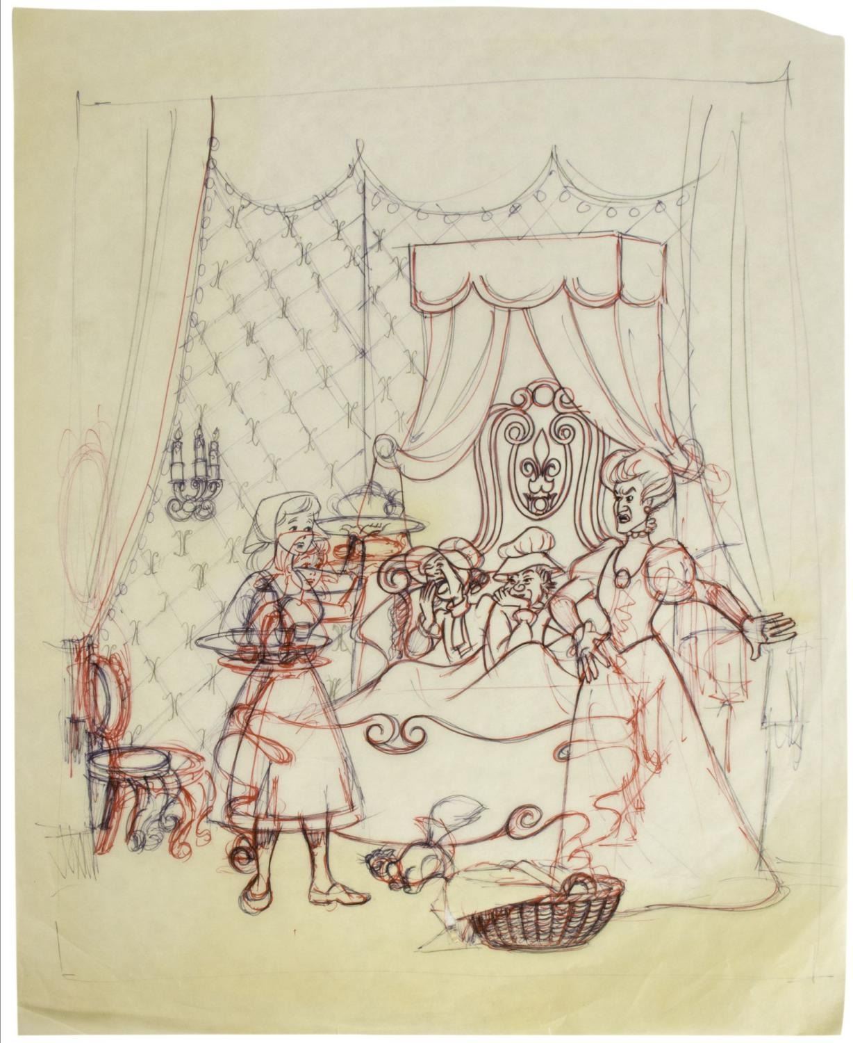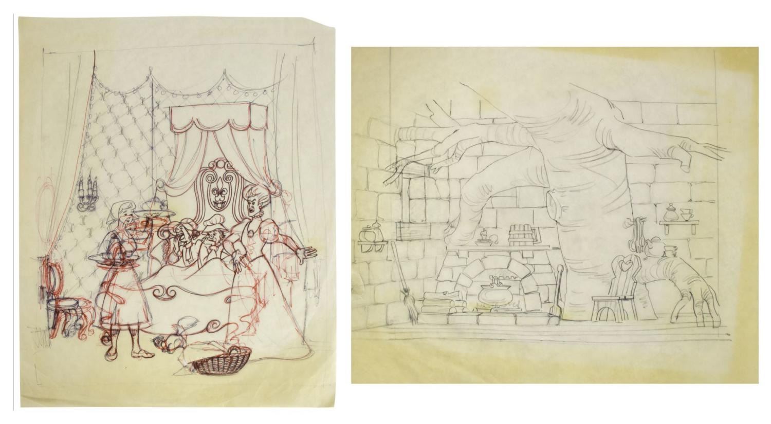 (Disney, 1970s-90s) A pair of layout drawings from “Cinderella” and “Sleeping Beauty,” most likely for storybook illustrations. One shows Cinderella serving her stepsisters in bed while Lady Tremaine looks on, and the other is the kitchen of Briar Rose’s cottage. Measuring 14” x 17” and 16” x 19”, the drawings accomplished in pencil and felt tip are in good production-used condition, with a 0.5” tear at the bottom center of the “Cinderella” drawing.