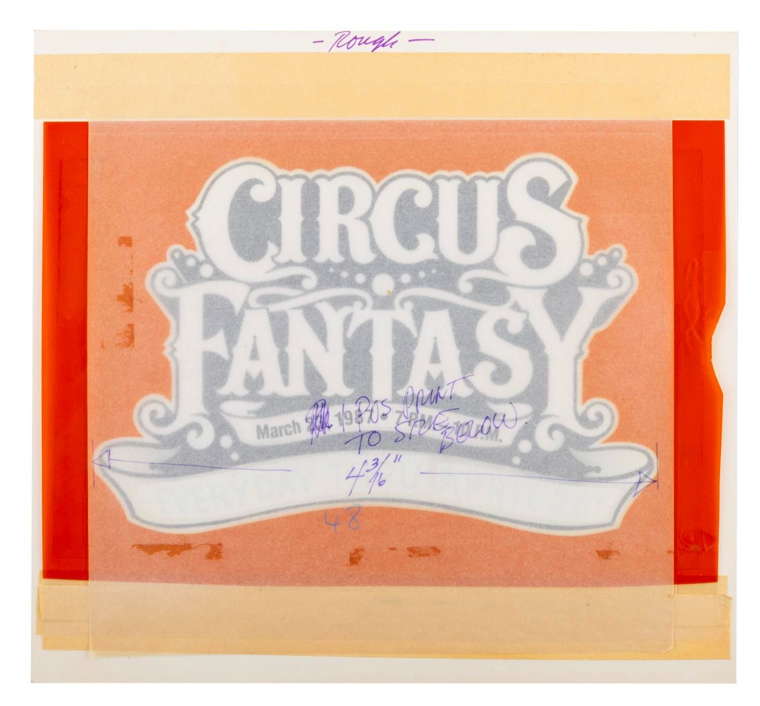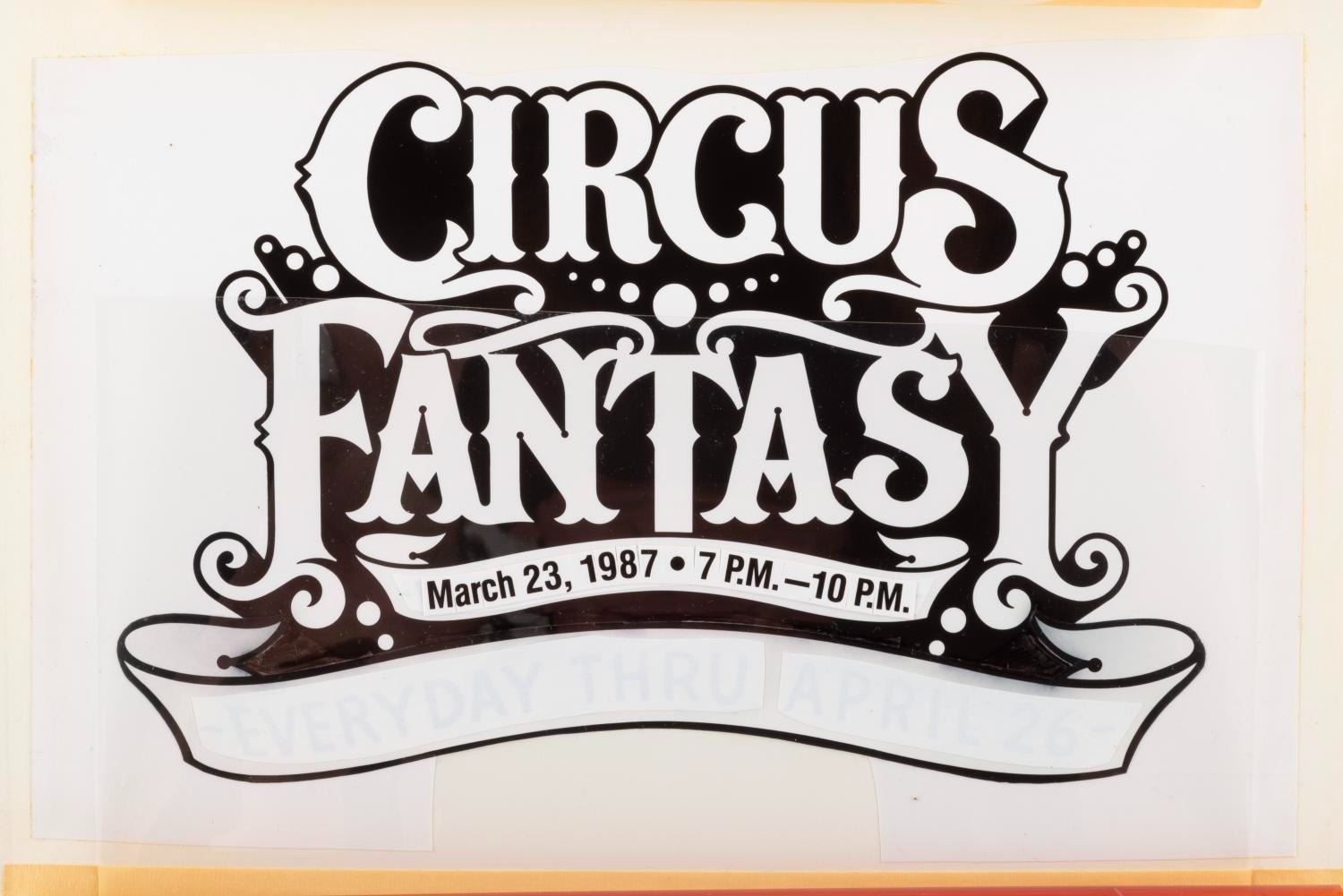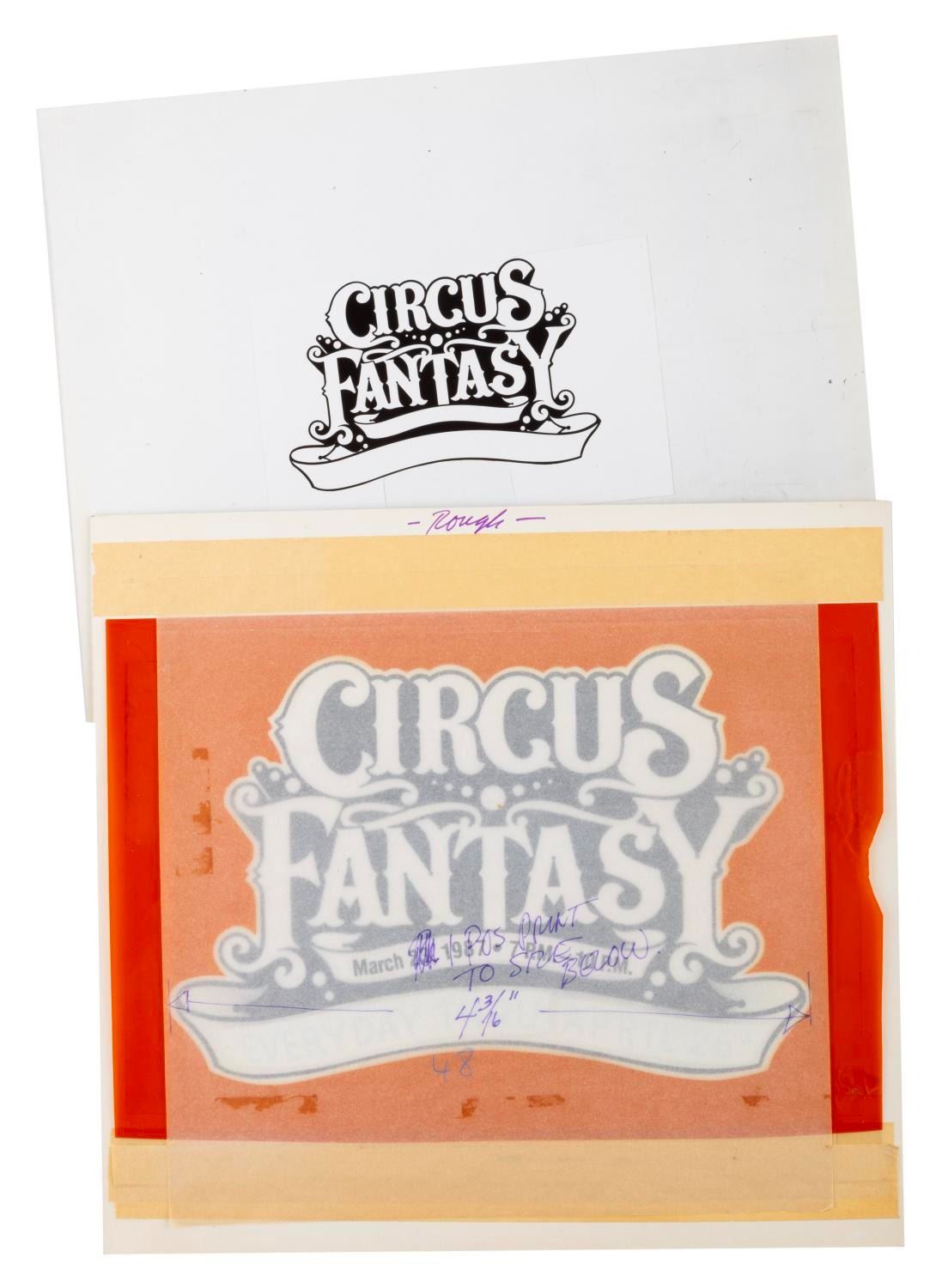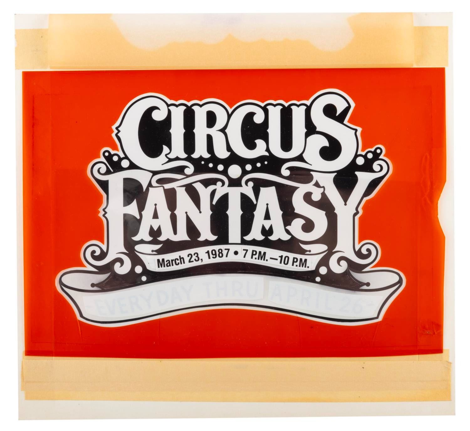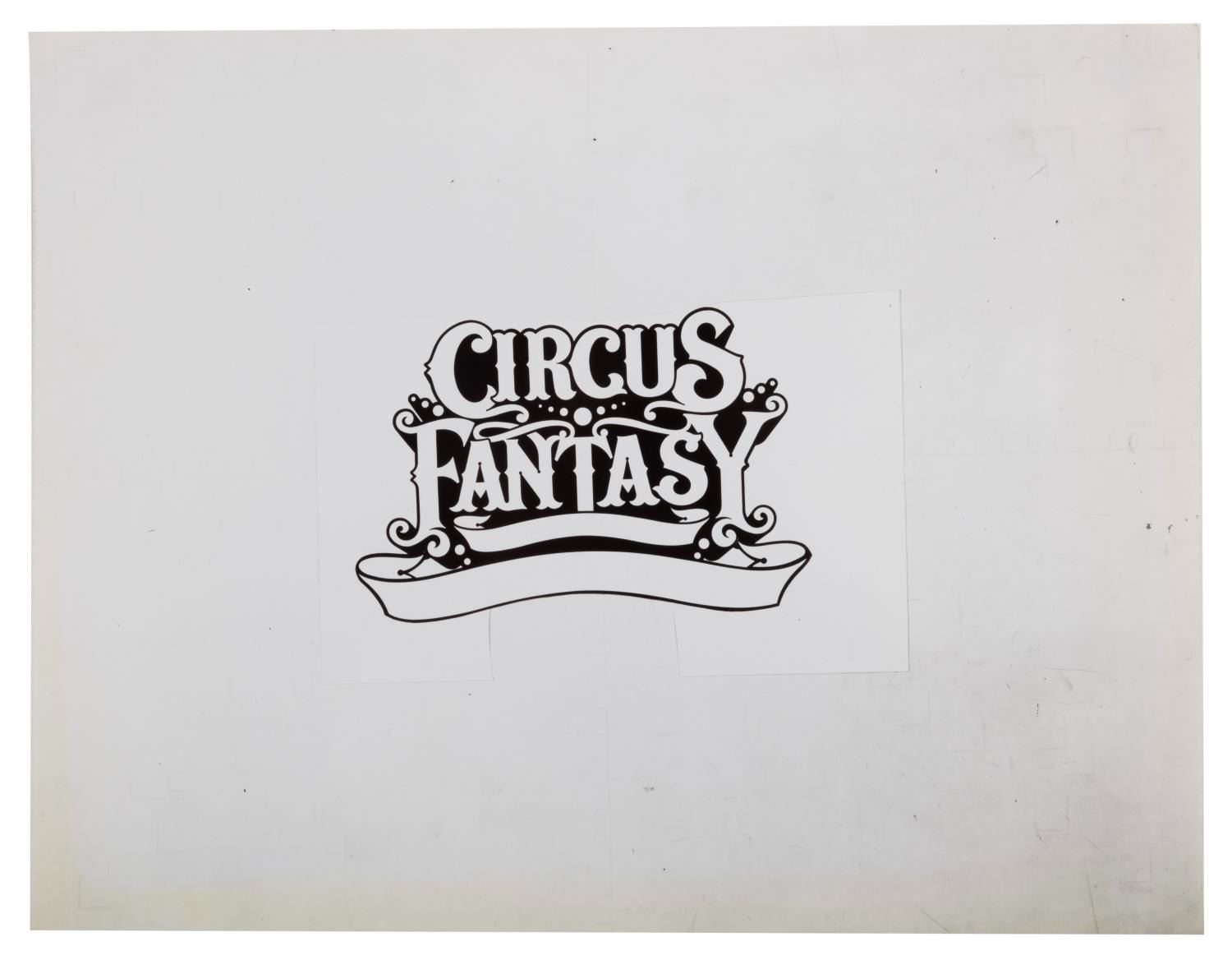 (Disneyland, 1987) Two logo layouts for the Circus Fantasy parade at Disneyland. Measuring 8.5" x 11" to 10" x 11", the logos are in good, production-used condition with discoloration, adhesive residue, and light soiling.
