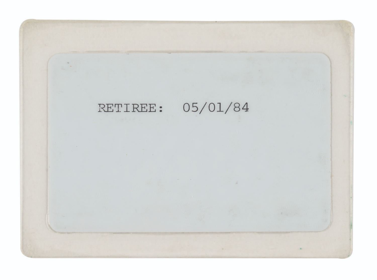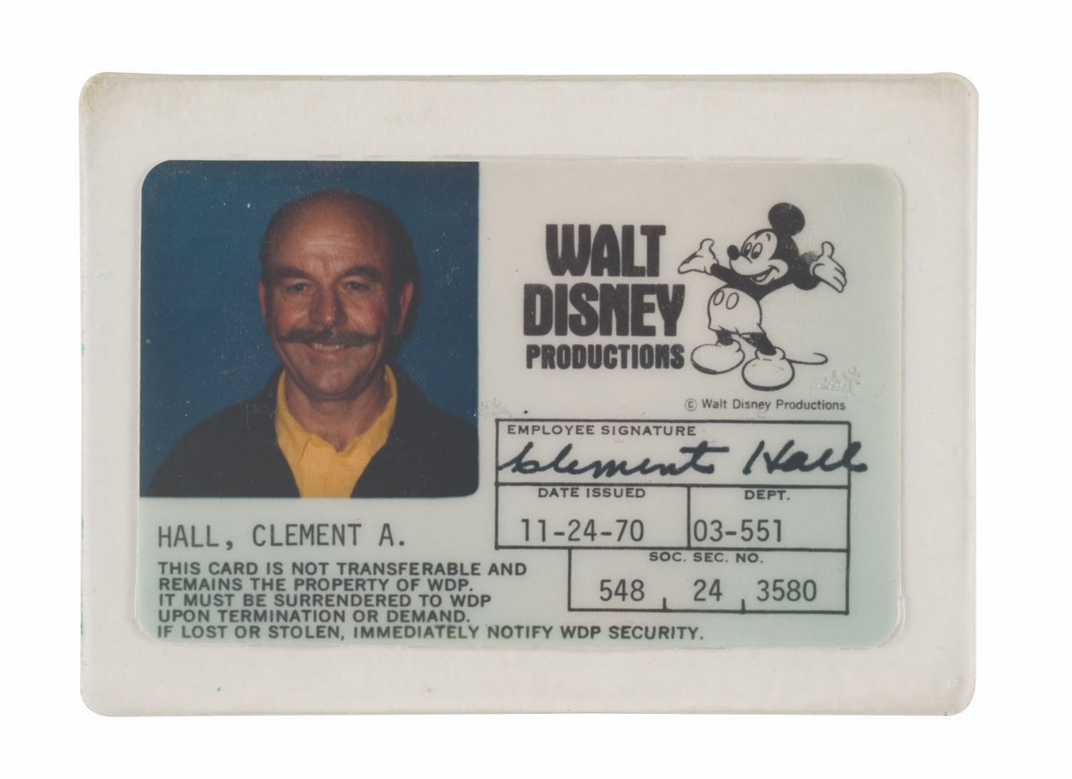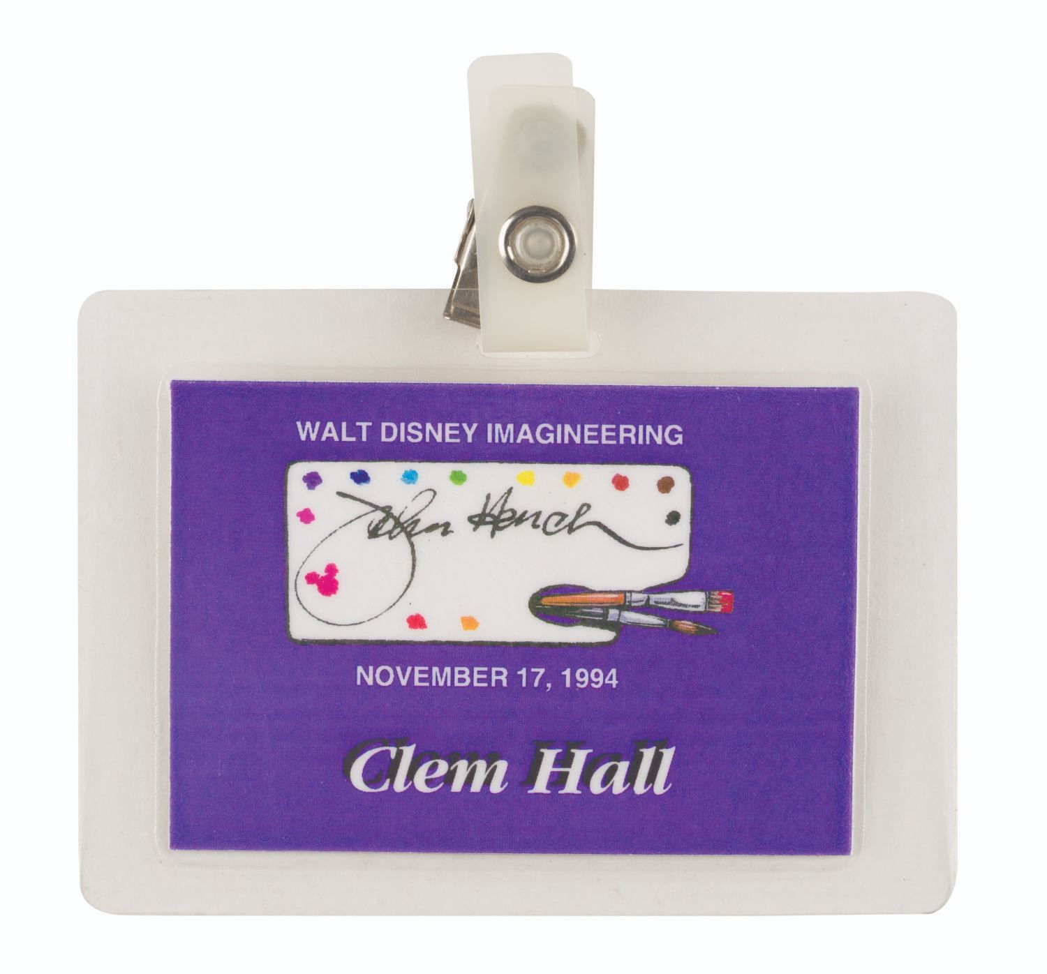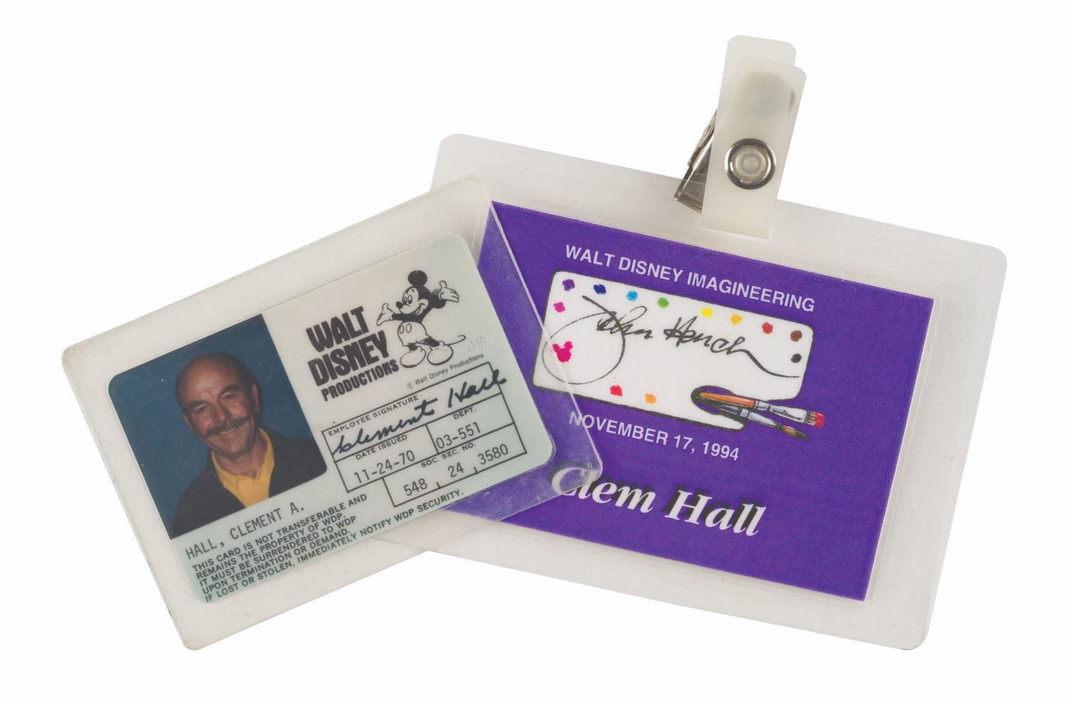 (WDI, 1970s-90s) A pair of identification badges belonging to Walt Disney Imagineer Clem Hall. Hall is renowned for his contributions to Pirates of the Caribbean, The Haunted Mansion, Space Mountain, Big Thunder Mountain Railroad, and The American Adventure at Walt Disney World. The pair includes his Walt Disney Productions I.D. issued "11-24-70," and a badge for an event held at Walt Disney Imagineering. Measuring 2.5" x 3.25" to 3" x 4.25" without the tag, the used pieces display in fine overall condition.