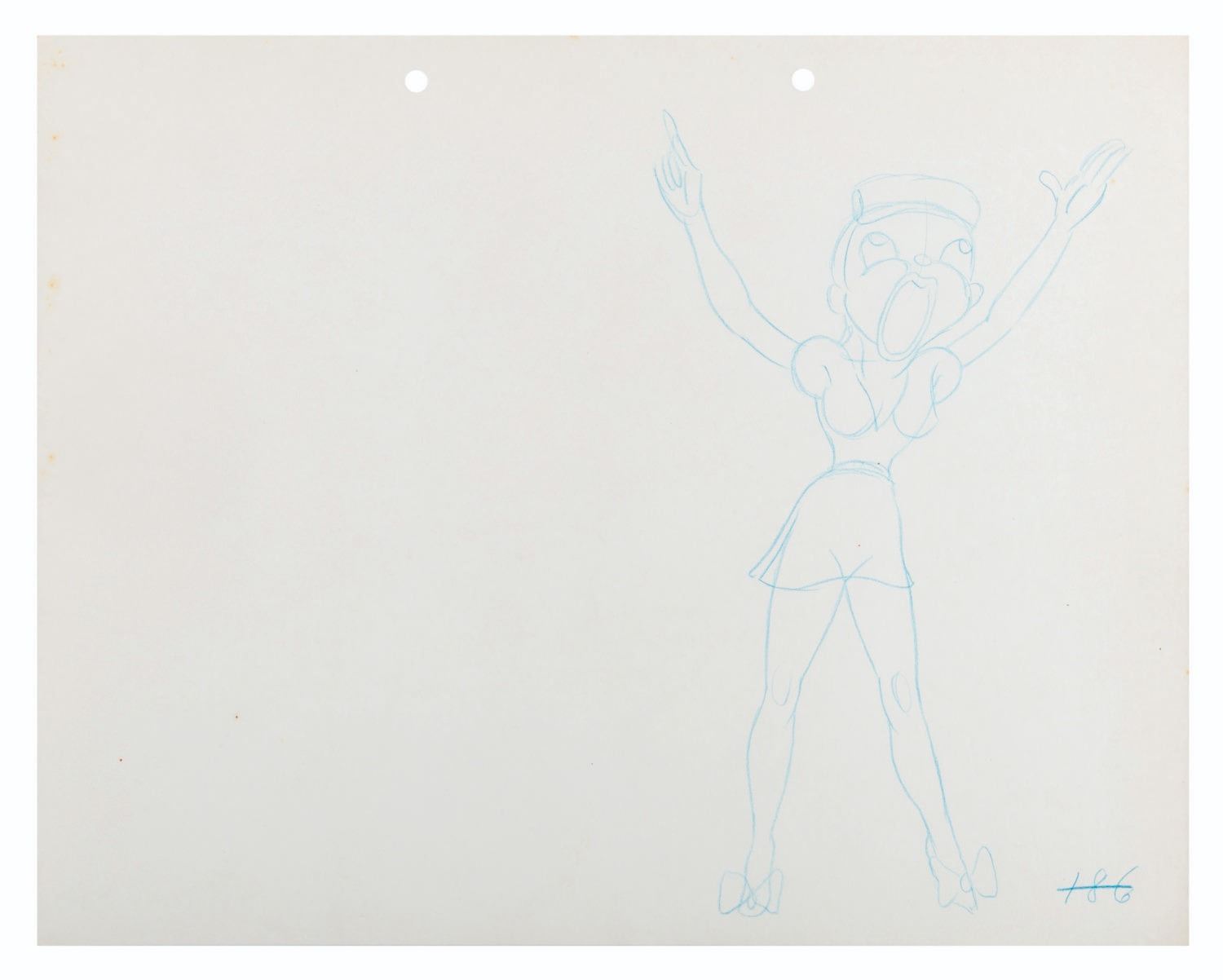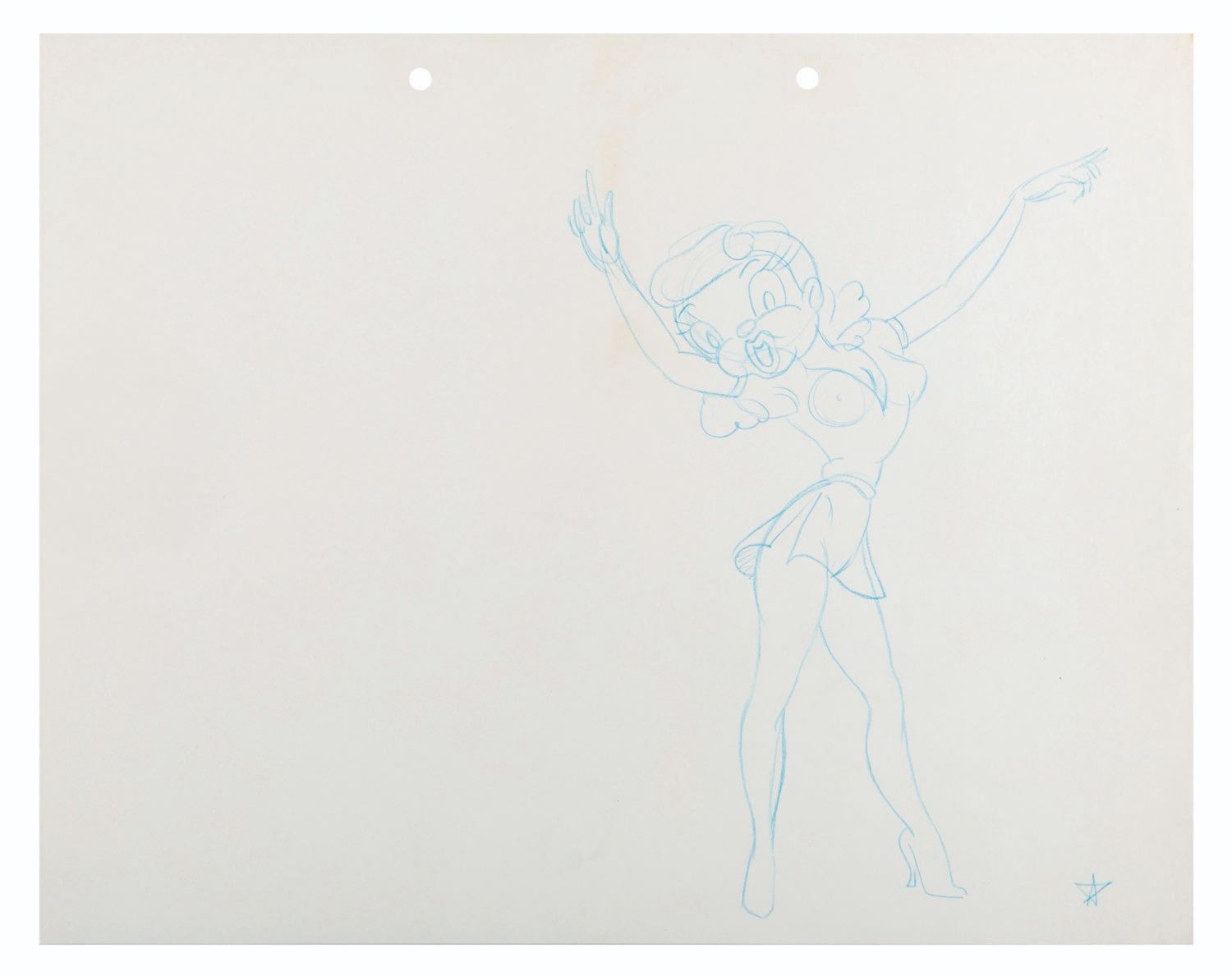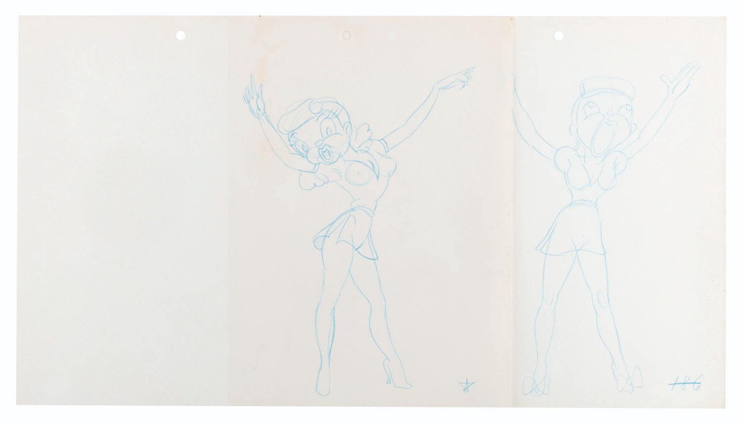 (Schlesinger, 1943) A pair of production drawings of So White from "Coal Black and de Sebben Dwarfs." Accomplished in color pencil with image sizes measuring 5.75" x 8" and 5” x 8.5” on 9.5" x 12" animation paper, the drawings display in very good condition with expected wear from production use and spots of discoloration from age.