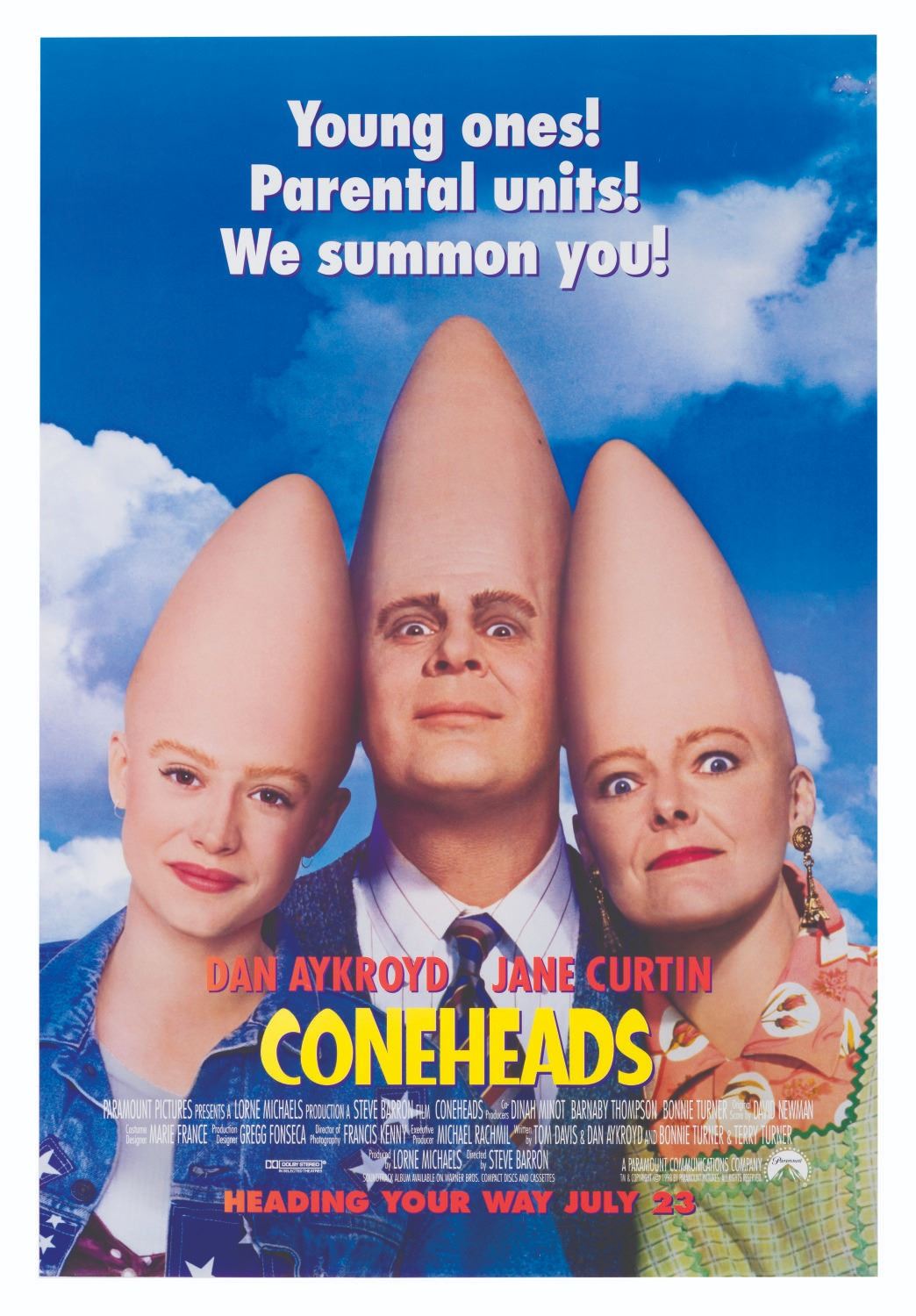 (Paramount, 1993) A pair of teaser one-sheets for “Coneheads,” the big-screen adaptation of the classic Saturday Night Live skit starring Dan Aykroyd and Jane Curtin. The poster featuring the faces of the actors is double-sided with a mirror image on one side. Measuring 27” x 40”, both posters display in good condition with light edge wear and creasing throughout, and heavy creasing along the bottom edge of the poster with character silhouettes.