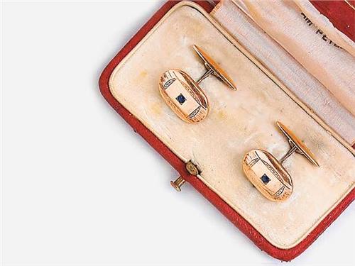 14 K gold, oval engraved decoration on the buttons, 2 small blue stones, Vienna, circa 1910, import mark, weight: 3.9 g.