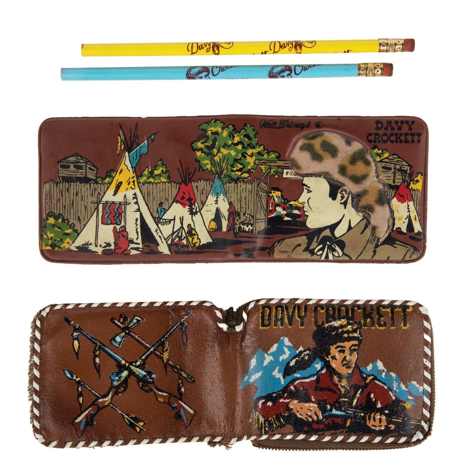 (Disney, Unknown, 1950s) A pair of Davy Crockett wallets & pencils. One wallet is composed of synthetic material and was manufactured for Walt Disney Productions, while the other has been crafted of saddle pigskin leather. The pencils were produced by an unknown manufacturer. Measuring 3.25"x4.25" and 3.25"x4.5", the wallets are in good condition despite scuffs and minor wear to threads, painted imagery, and synthetic accents. Measuring 7.5" long, each pencil is in very good unused condition with few mild scuffs.
