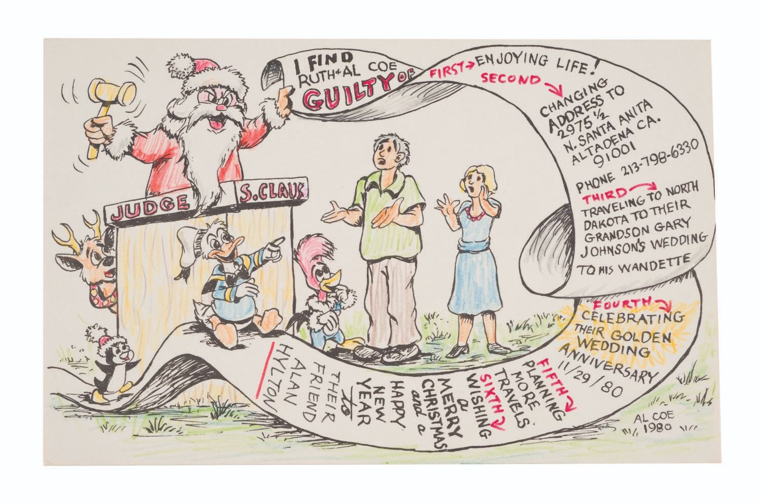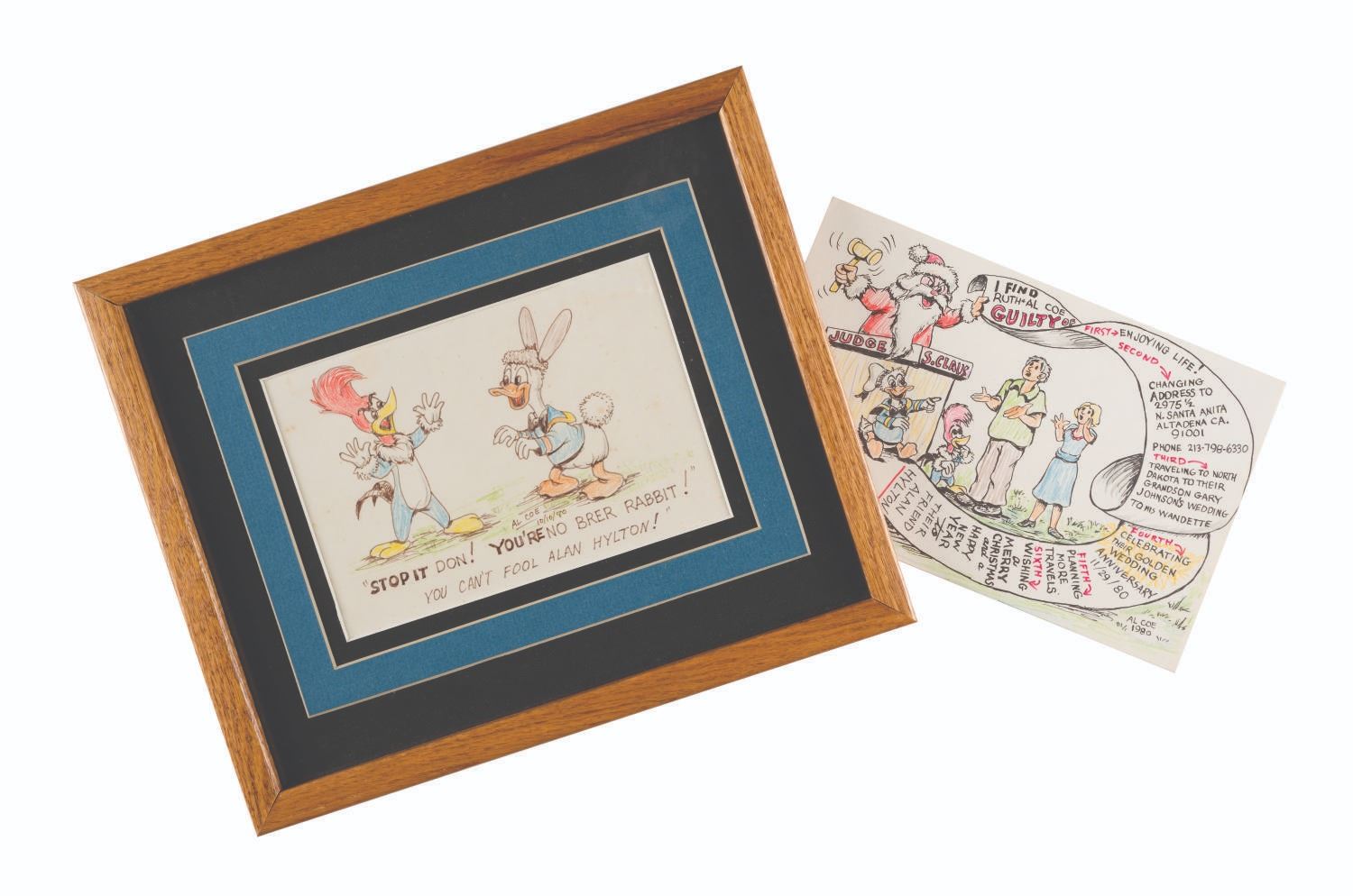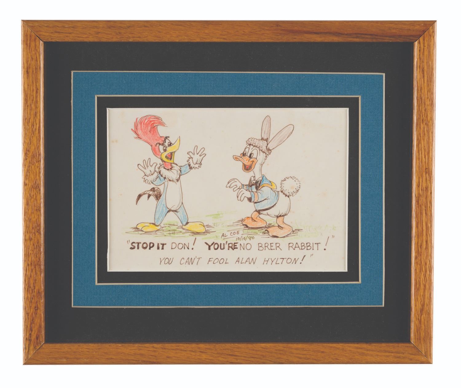 (Disney/Lantz, 1960s) A pair of drawings by animator Al Coe, who worked for both Walt Disney and Walter Lantz during his long career. Coe was renowned for producing hand-drawn gag art, Christmas cards, and seasonal illustrations. The pieces depict Woody Woodpecker and Donald Duck with other characters including Chilly Willy and Al and Ruth Coe. Accomplished in colored pencil and ink and measuring 5.5" x 7" and 5.5" x 8.75", the pieces are in fine condition.
