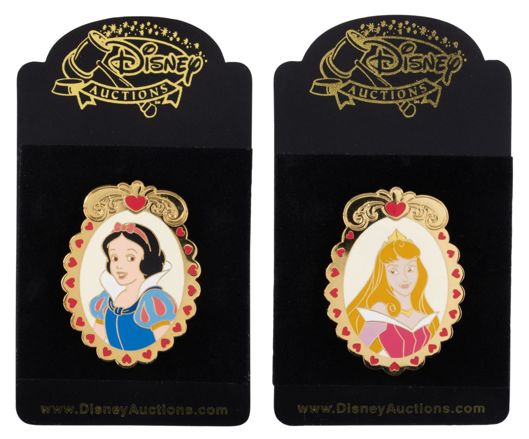 (Disney, 2003) A pair of Disney Auctions heart frame pins of Snow White and Aurora from “Sleeping Beatuy,” released in a limited edition of 250. The pins are in fine condition on their original cards.