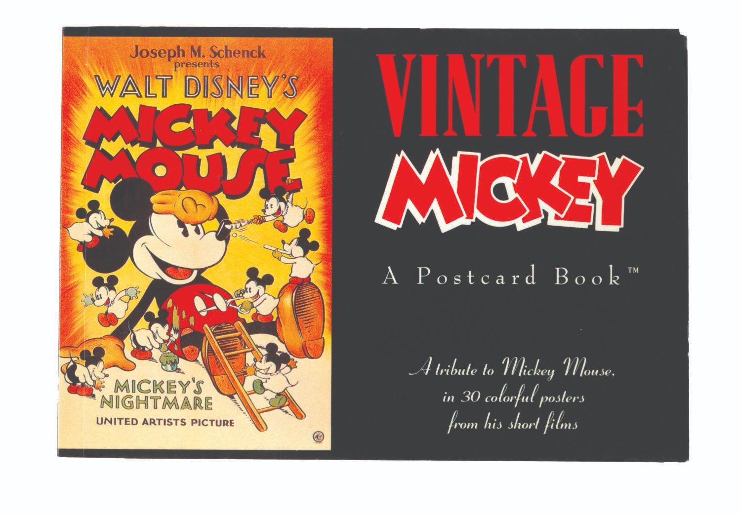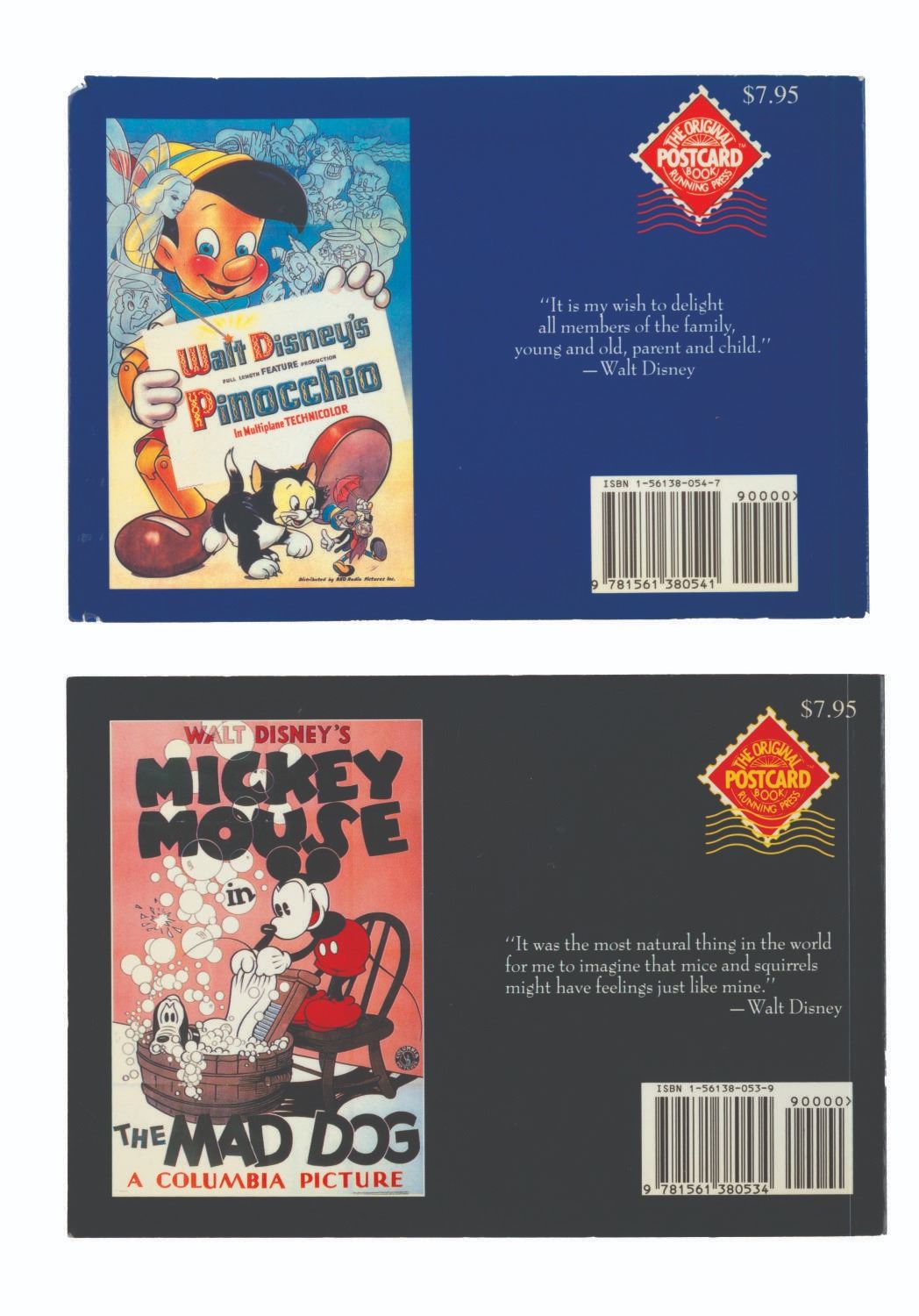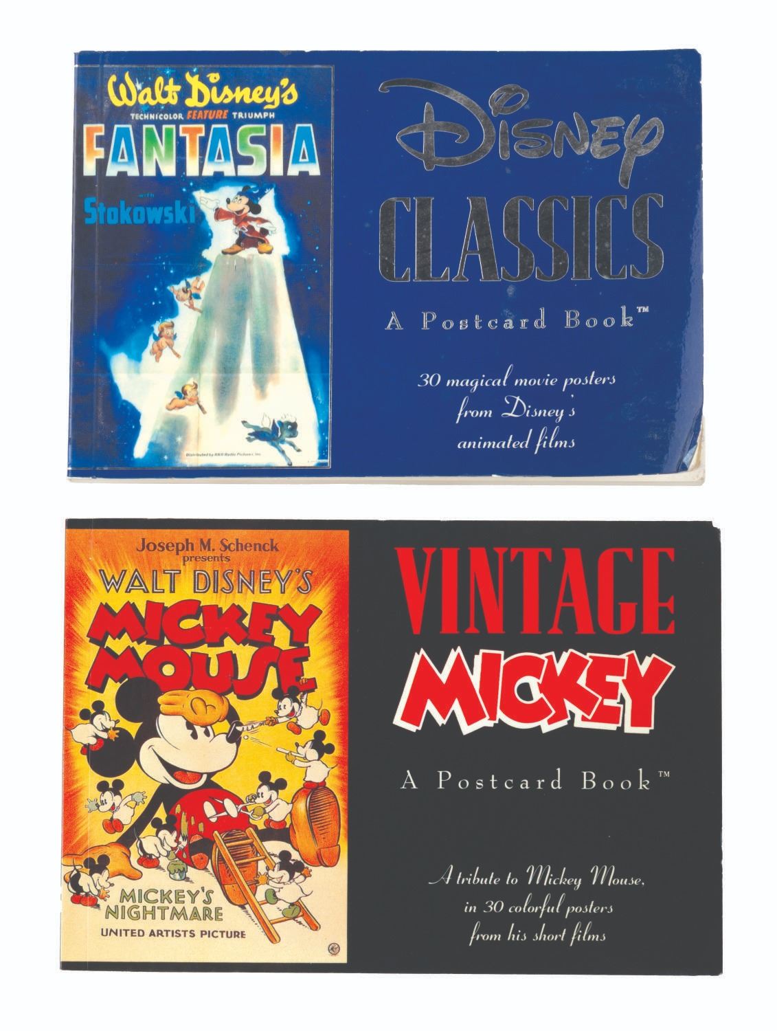 (RunningPress, 1991) A pair of postcard books featuring 30 cards of classic Mickey Mouse posters, and 30 of Disney animated features. The books are in very good condition with light handling wear to the covers.