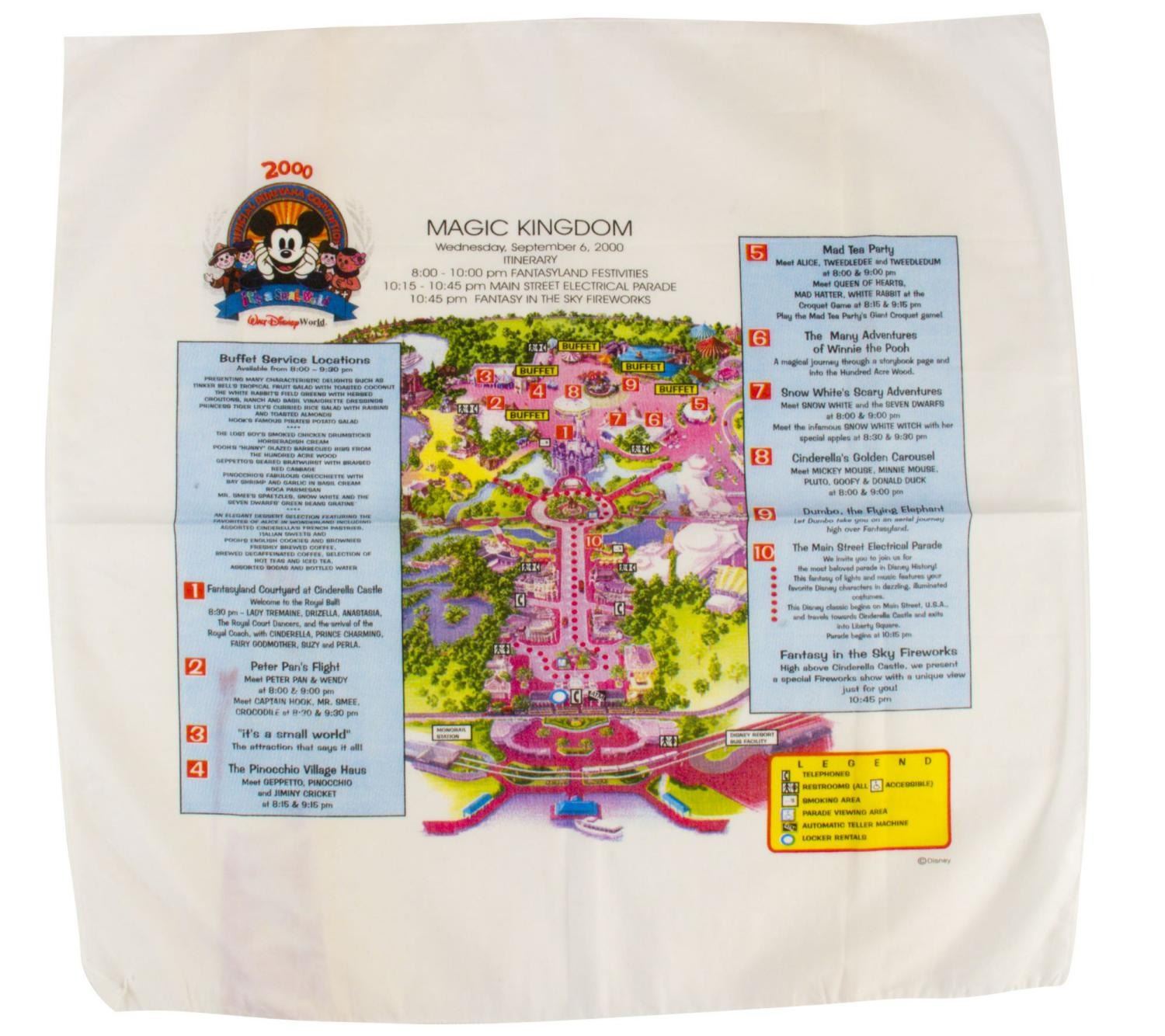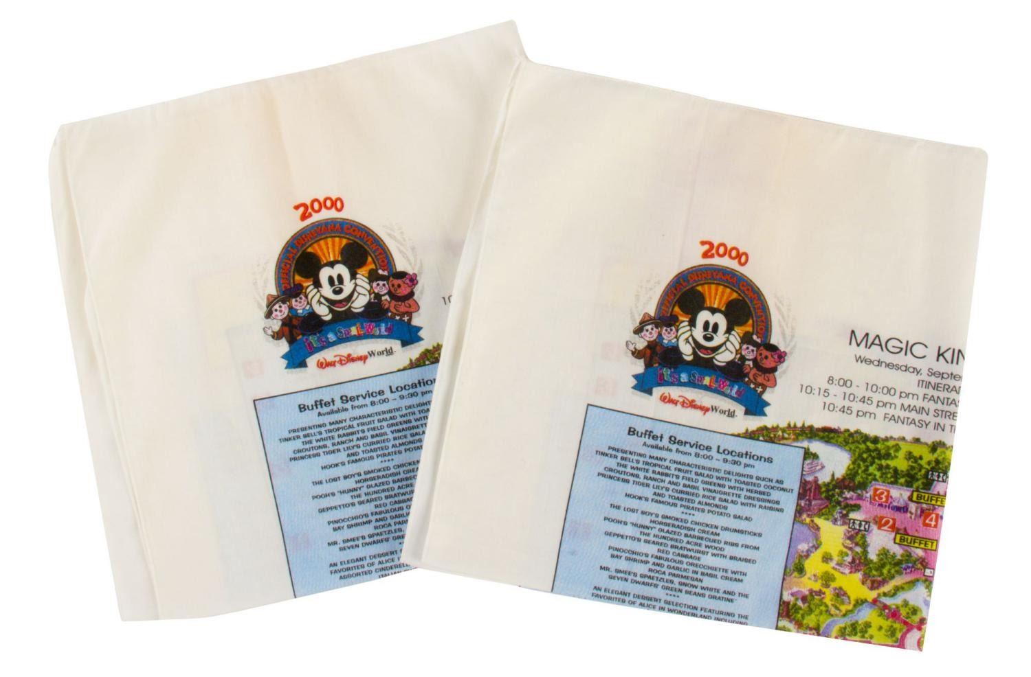 (Disneyana, 2000) A pair of Disneyana 2000 handkerchiefs or bandanas featuring the convention's schedule and a Disneyland Park map. Each measuring 21" x 21.5", the bandanas are in fine condition.
