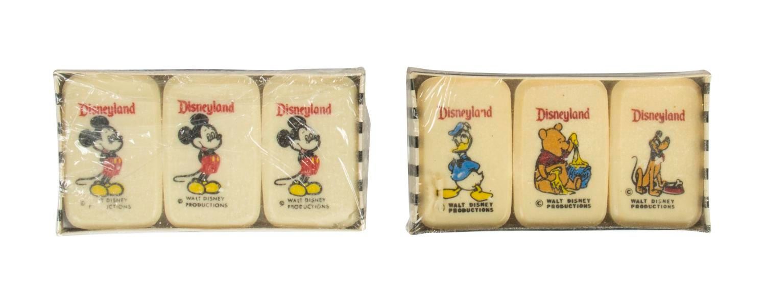 (Disneyland, 1960s-70s) A pair of boxed soap sets from Disneyland; one with 3 Mickey Mouse soaps, and the other with 3 featuring Donald Duck, Winnie the Pooh, and Pluto. Each box measures 3" x 5.25" and 1" thick, and the condition is very good.