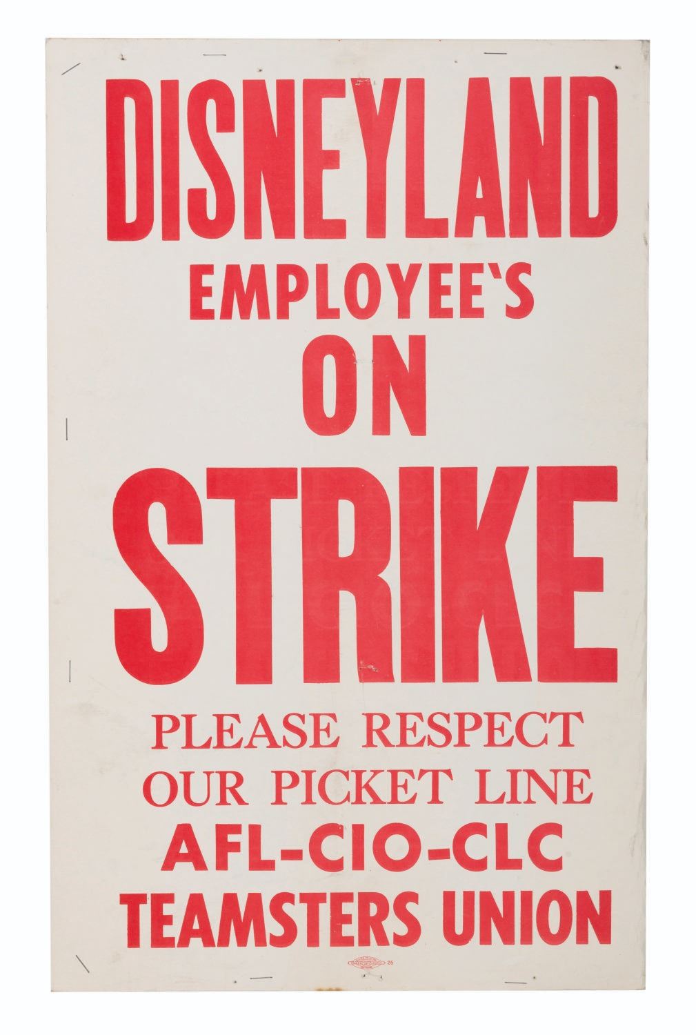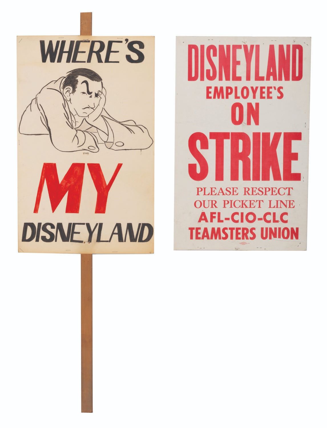 (Disneyland, 1984) A unique pair of picket signs from the historic Teamsters Union Strike of Disneyland in 1984. These signs were created and used by some of the 1,800 picketers facing a wage freeze, who went on strike for 22 days until an agreement was reached. This set notably includes both a printed picket sign and a hand-drawn picket sign that was featured in a Times newspaper photo image depicting Its a Small World Attractions Hostess Karen Jenson. The signs are accompanied by xerox copies of the newspaper article featuring Jenson. Measuring 22”x14” on a 42” stick this historic artifact is in very good condition, with scuffs, spots of discoloration, and wear from original use.