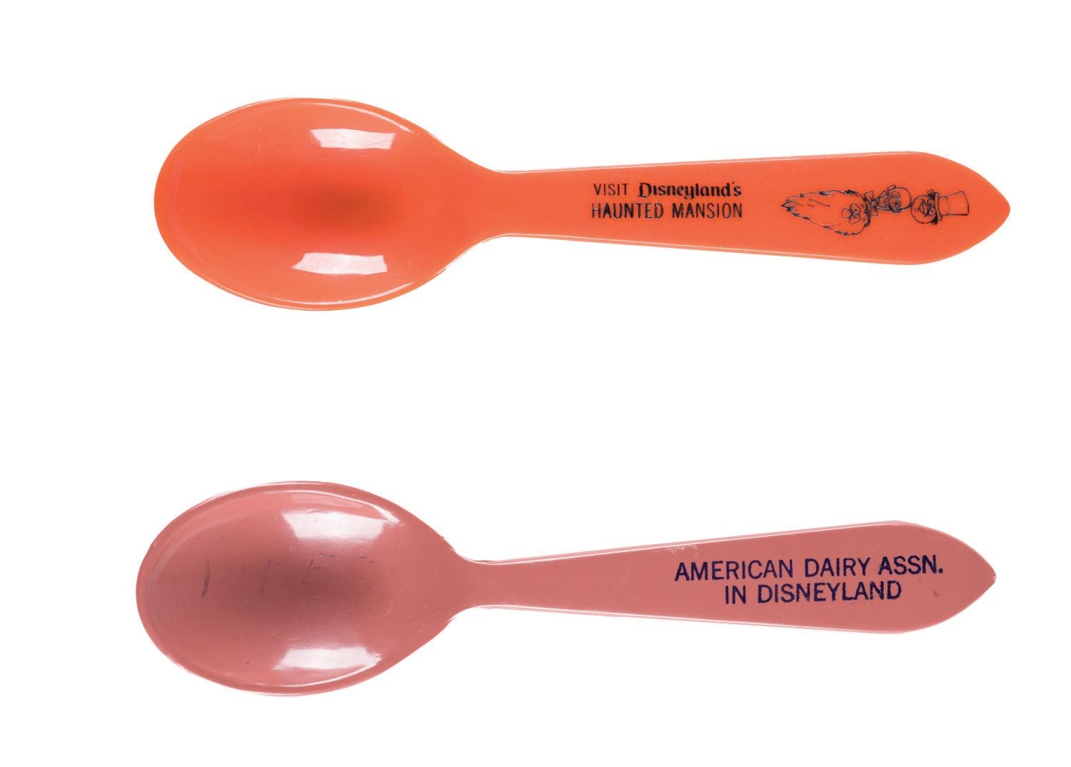 (Disneyland, 1956-58/1969) A Pair of extremely rare vintage Disneyland plastic ice cream spoons. The spoons from the (c. 1956-58) American Dairy Association exhibit and the Haunted Mansion "I Scream Sundae" (inspired by the opening of the attraction). The latter spoon features imagery of Hitchhiking Ghosts Phineas, Ezra, and Gus and was only offered with promotional sundaes at Carnation during 1969 and 1970. Measuring 5" long, each spoon is in very good condition with minor scuffs and wear from handling and age.