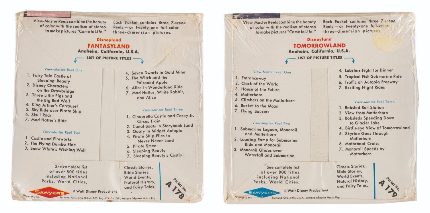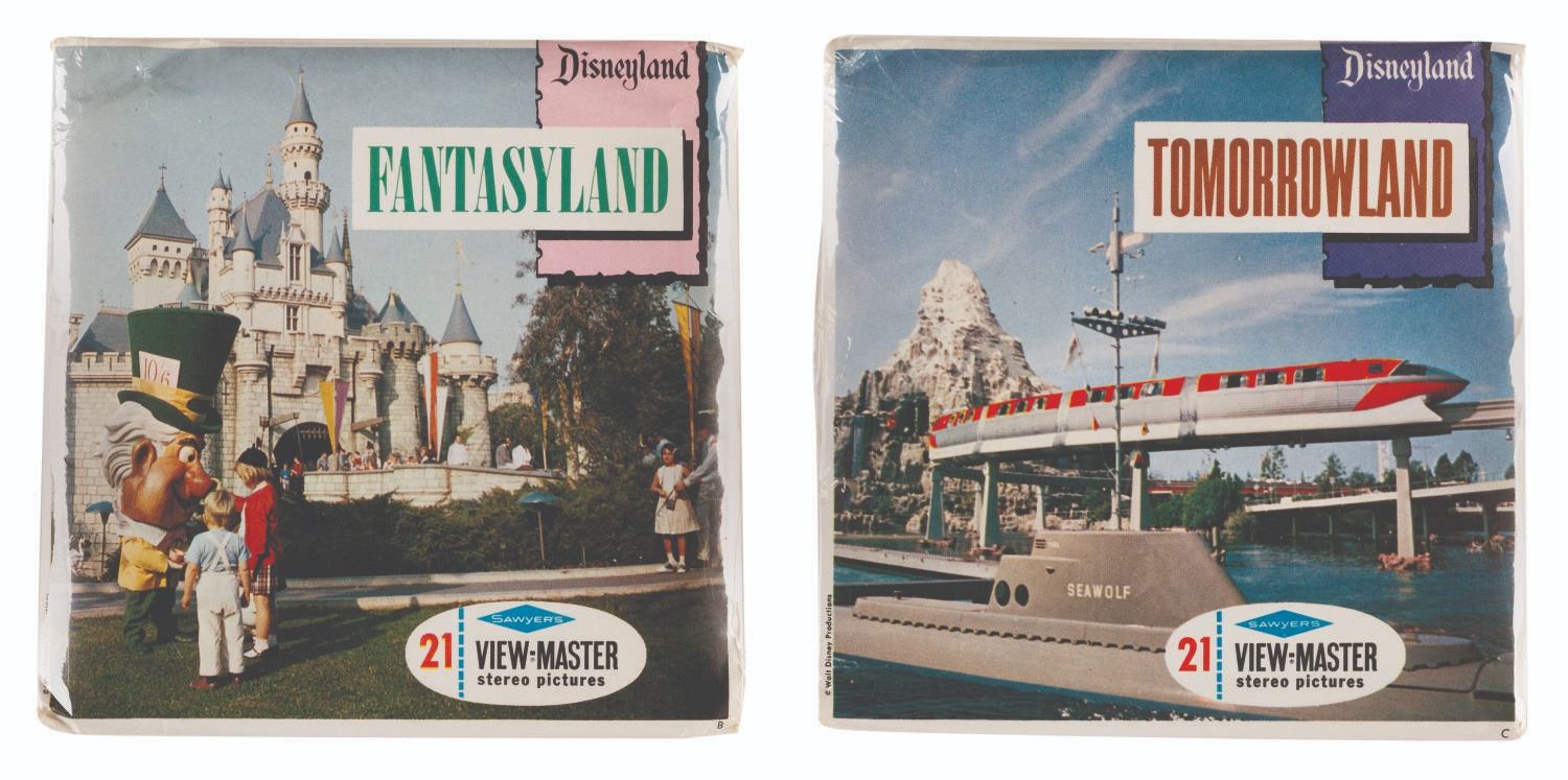 (Sawyer's, 1956-59) A pair of Disneyland View-Master 3-disc slide sets of Fantasyland and Tomorrowland. Each contains 21 color stereo pictures of attractions. Measuring 4.5" x 4.5", the sets are in very good condition, sealed in their original packaging with light edge wear and creasing.