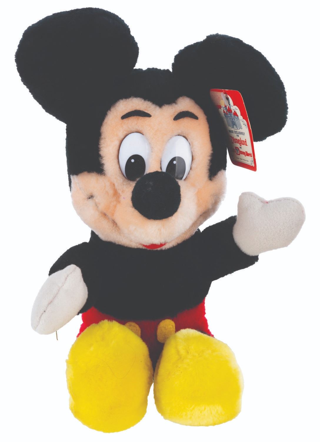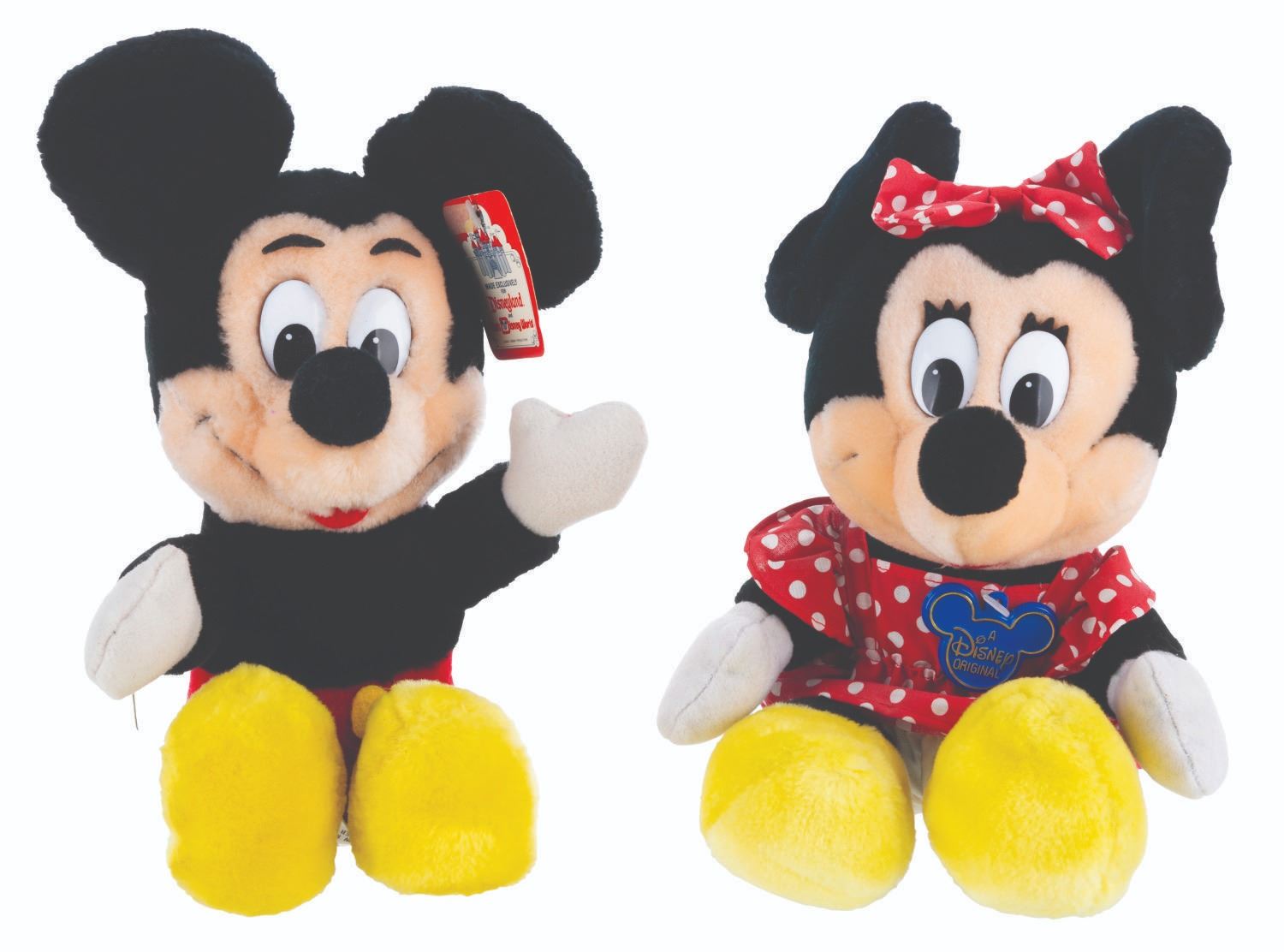 (Disneyland/Walt Disney World, 1970s-80s) A pair of Mickey and Minnie plush dolls, each with a tag for sale at both Disneyland and Walt Disney World. Each sitting 9" tall, the plushes are in very good condition with light wear from age.