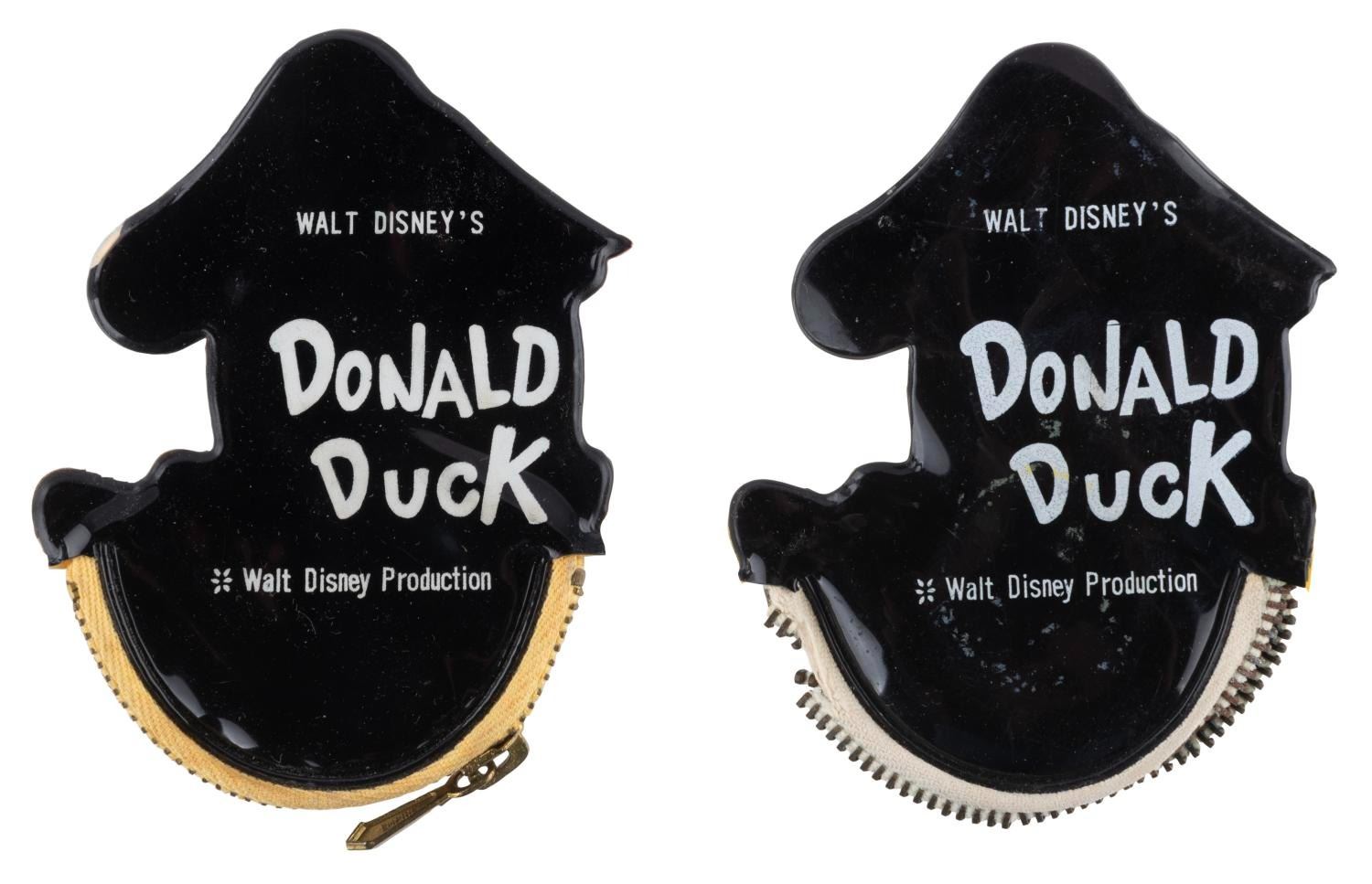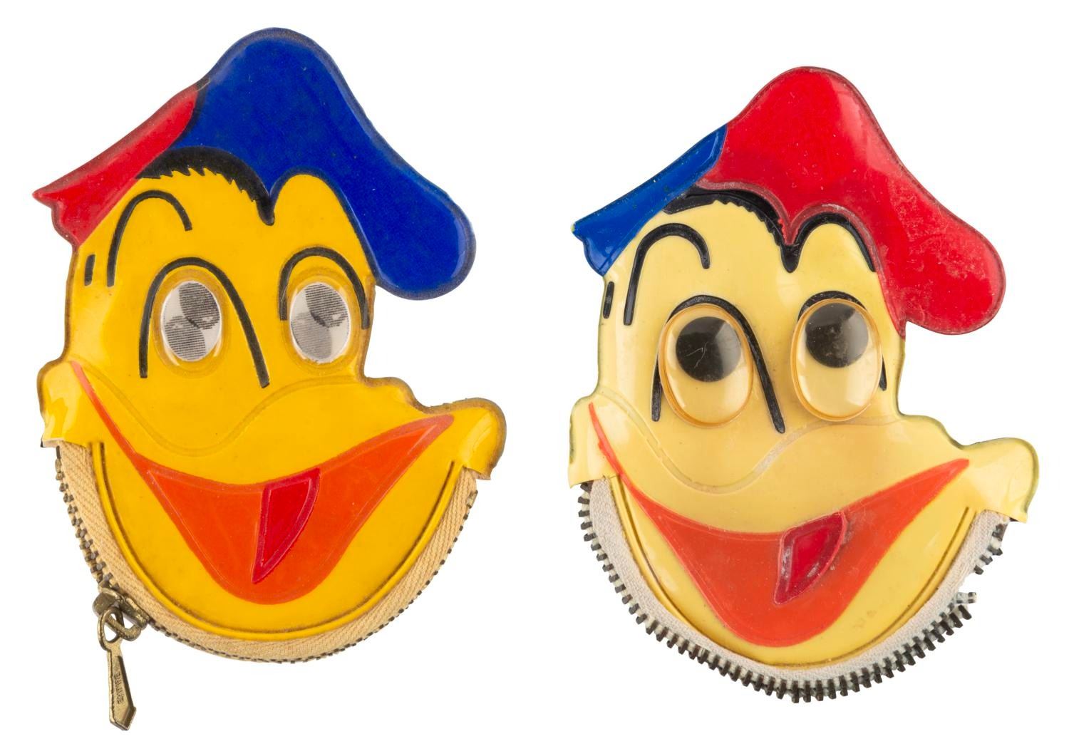 (Disney, 1960s) A pair of unusual Walt Disney’s Donald Duck vinyl coin purses, one with lenticular eyes and one with googly eyes. Measuring 3" x 4" each, the coin purses display in good condition with stains, wear, discoloration from age, and one missing its zipper.