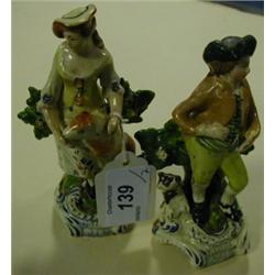 A Pair of Early 19th Century Staffordshire Figures, the lady with a sheep, a gentleman with a dog...