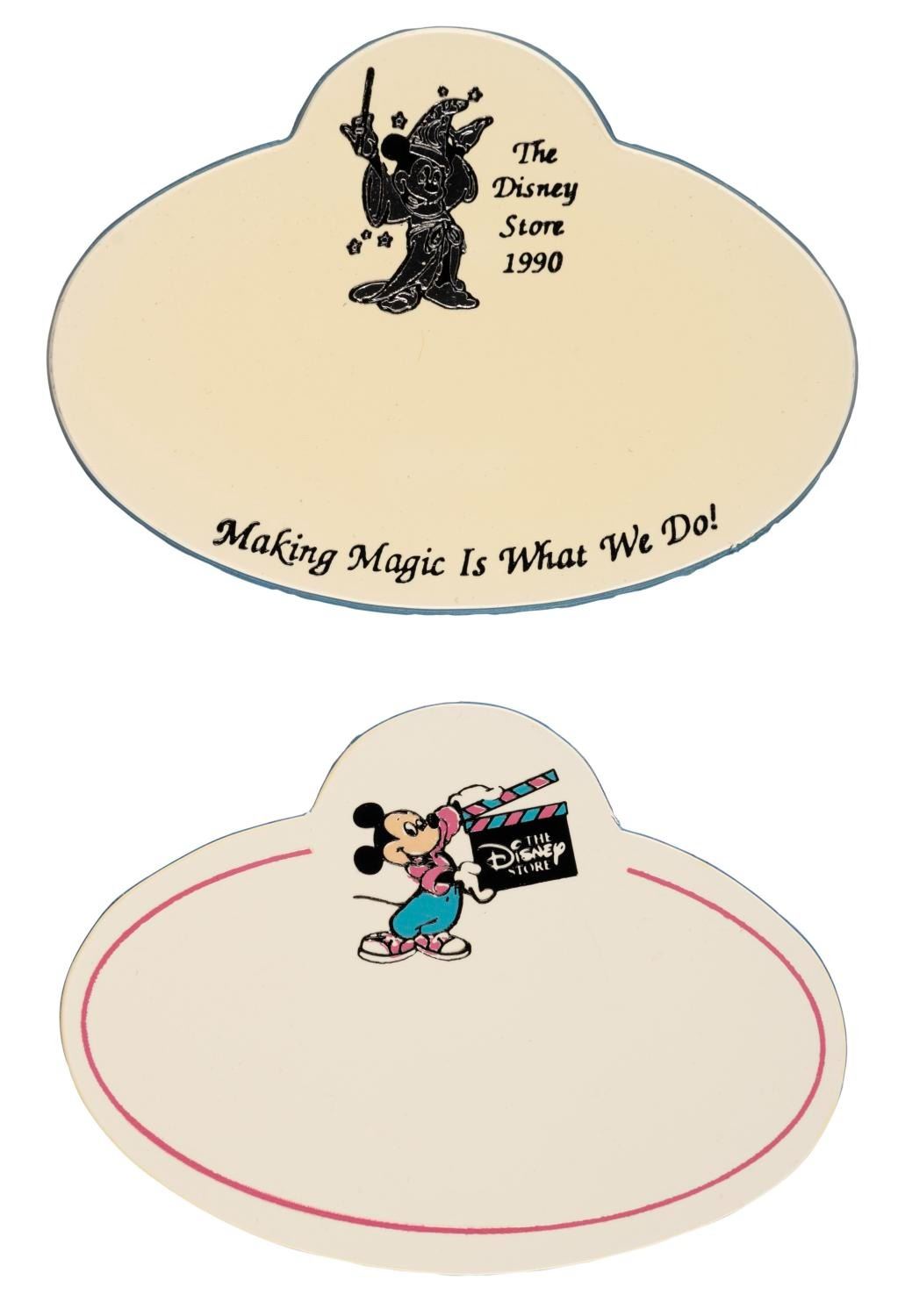 (Disney, 1987/1990) A pair of unused Disney Store Cast Member badges, without pins. Each measuring 2.75" x 2", the badges are in fine condition.
