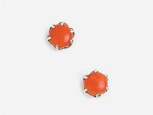14 K gold, 2 claw set coral lenses, screw earrings, circa 1930, weight: 3.3 g.