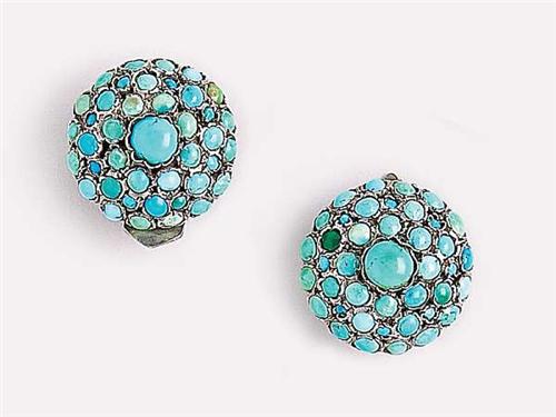 Silver, conical round forma, pave set different colour and size turquoises, metal clips fitting, altered from a jewel from around 1900, gross weight: 18.8 g.