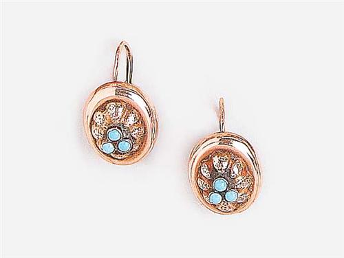 14 K gold, flower like, oval form, embossed decoration, blue porcelain bead decoration, front closing swivel, late 19th century, weight: 2.9 g, the suspending part is missing, worn.