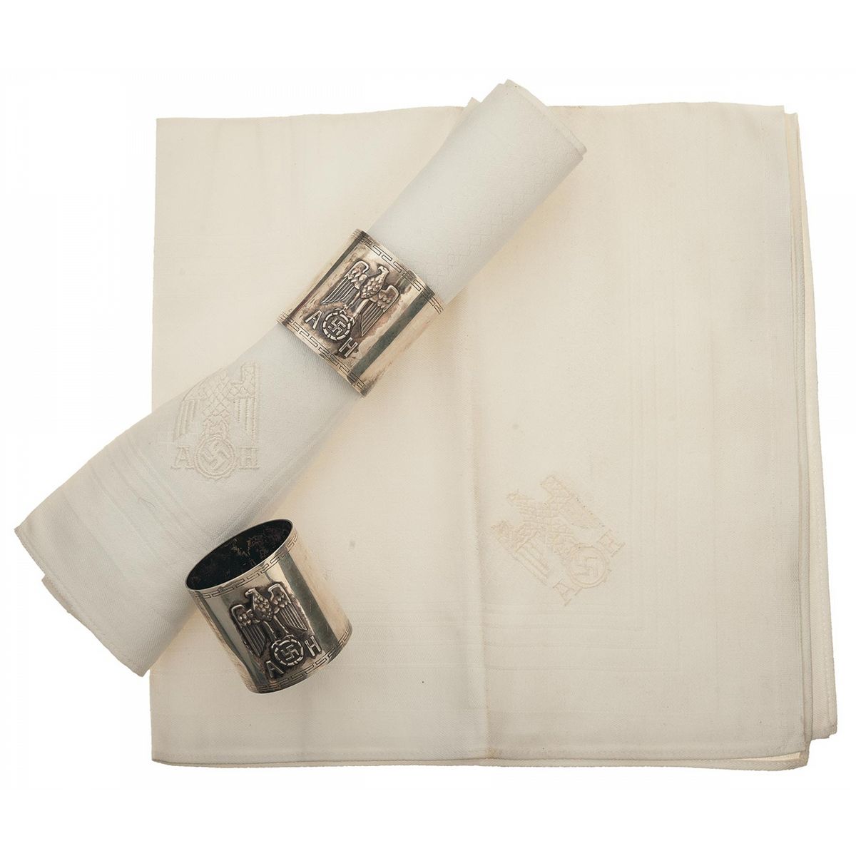 A Pair of Embroidered Napkins with Silver Rings, All Bearing Nazi Markings and the Initials of Adolph Hitler