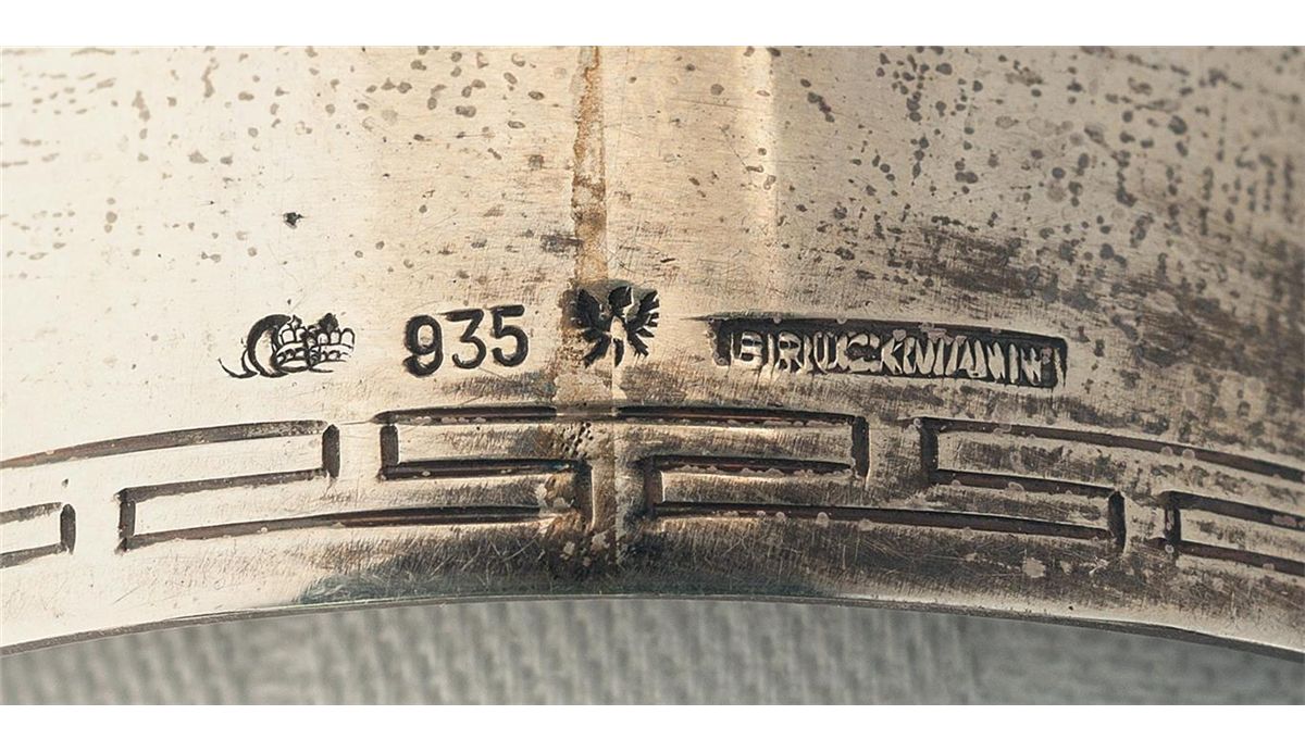 All four items in this lot are of a style that is attributed to a complete set of silver tableware presented to Adolph Hitler on his 50th birthday by the silversmiths of Bruckmann. Reportedly, this set was kept in the Eagle's Nest, and was broken up and brought back to the States as souvenirs by the soldiers who occupied the building. 1) Two silver napkin rings, 1 3/4 inches wide and 1 3/4 inches tall, with an engraved Greek key border at top and bottom, a raised stamped Nazi eagle flanked by "A H" on the front, and the makers marks of a crescent moon and crown followed by "935", "eagle" and "BRUCKMANN" on the rear. 2) Two napkins, both white linen, 19 inches square, with a series of concentric square designs as decoration. In one corner of each is an embroidered Nazi eagle flanked by the "AH" initials. No makers marks are present.