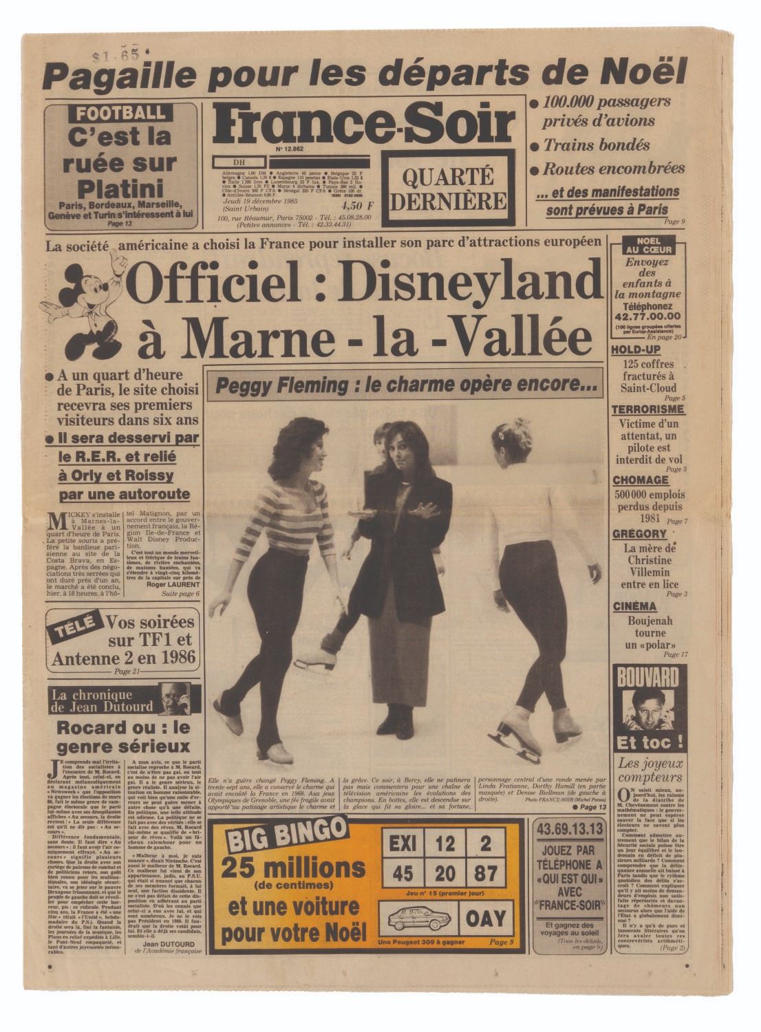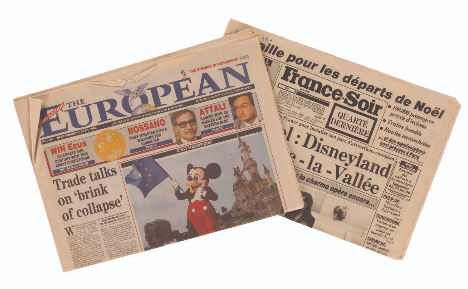 (France-Soir/The European, 1985/1992) A December 19, 1985 copy of France-Soir newspaper announcing Disney’s deal to bring a Park to France and an April 16, 1992 copy of The European from the opening of Euro Disneyland. Measuring 15.5” x 21” and 16” x 22.5” respectively, the newspapers display in very good condition with light creases, tears, and discoloration from age.