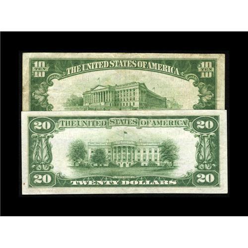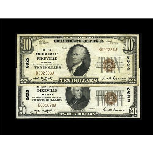 <B> A Pair of First National Bank of Pikeville Notes</B></I><BR>Pikeville, KY - $10 1929 Ty. 1 First National Bank Ch. # 6622 <B>Very Fine</B></I><BR>Pikeville, KY - $20 1929 Ty. 1 First National Bank Ch. # 6622 <B>About Uncirculated</B></I>.<BR>