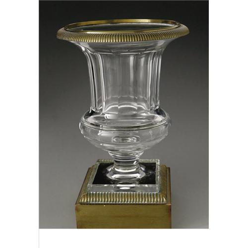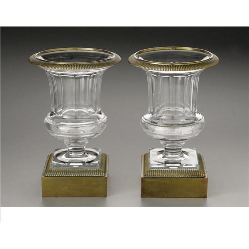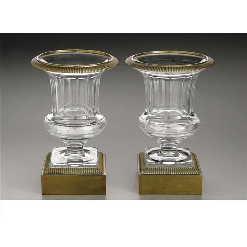 <B>A Pair of French Glass and Brass Mounted Garniture Urns</B></I><BR><BR>Unknown maker, France<BR>Late Nineteenth/Early Twentieth Century<BR>Glass and brass<BR>Unmarked<BR>10 in. high<BR><BR>Of campana form, raised on a squared pedestal base, the lip and foot with gadrooned brass mounts.<BR><BR>Provenance:<BR>Walsh Family Art Trust