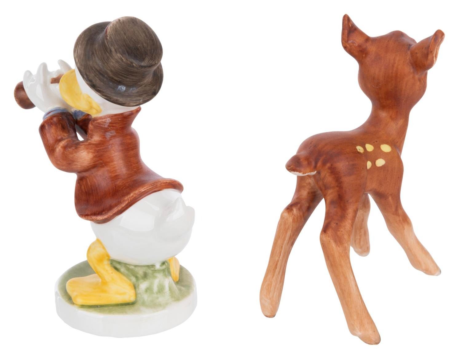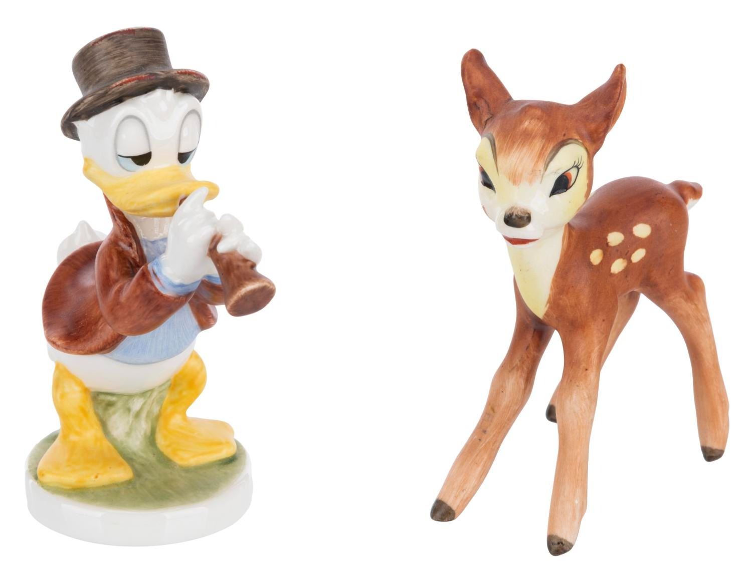 (Goebel, 1990s) A pair of ceramic figurines of Donald Duck playing a horn, and Bambi. Each standing 3” high, the figures are in very good condition, with writing under Donald’s base