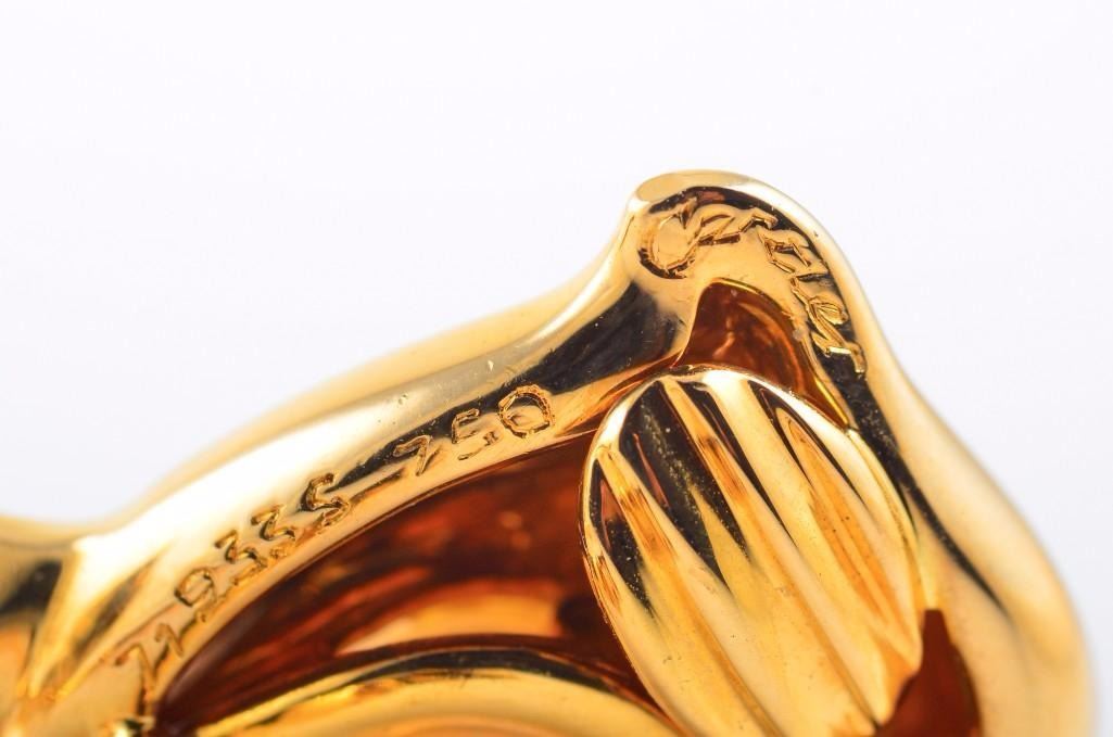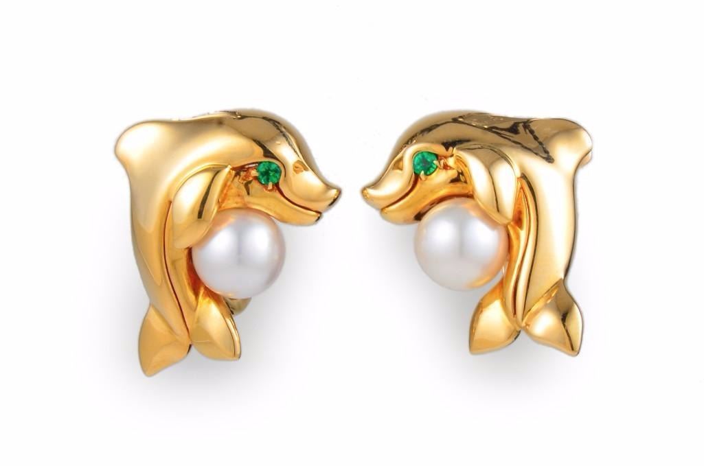 Designed as a pair of 18K yellow gold dolphin-shaped earrings, with two emerald eyes, and two pearls; signed 719335 750; earrings each measure 7/8 inches x 5/8 inches; weight 18.4g.