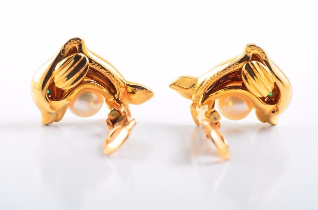A Pair of Gold Pearl and Emerald Dolphin Earrings, by Cartier